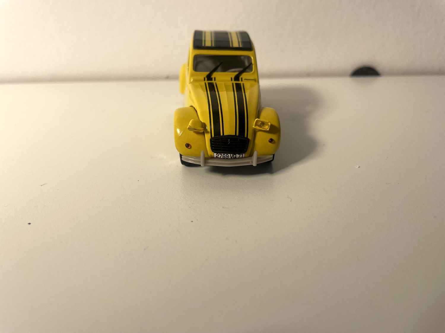 Voiture Miniature Citroën 2 CV 6 jaune avec rayures noires - Norev (ATTENTION: les phares avants sont de travers)