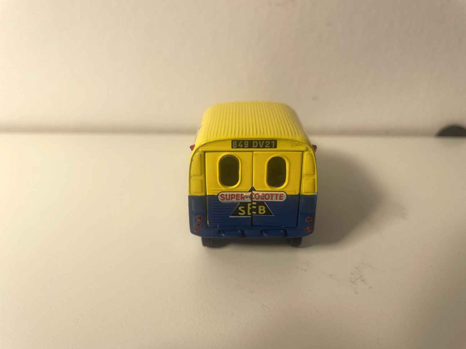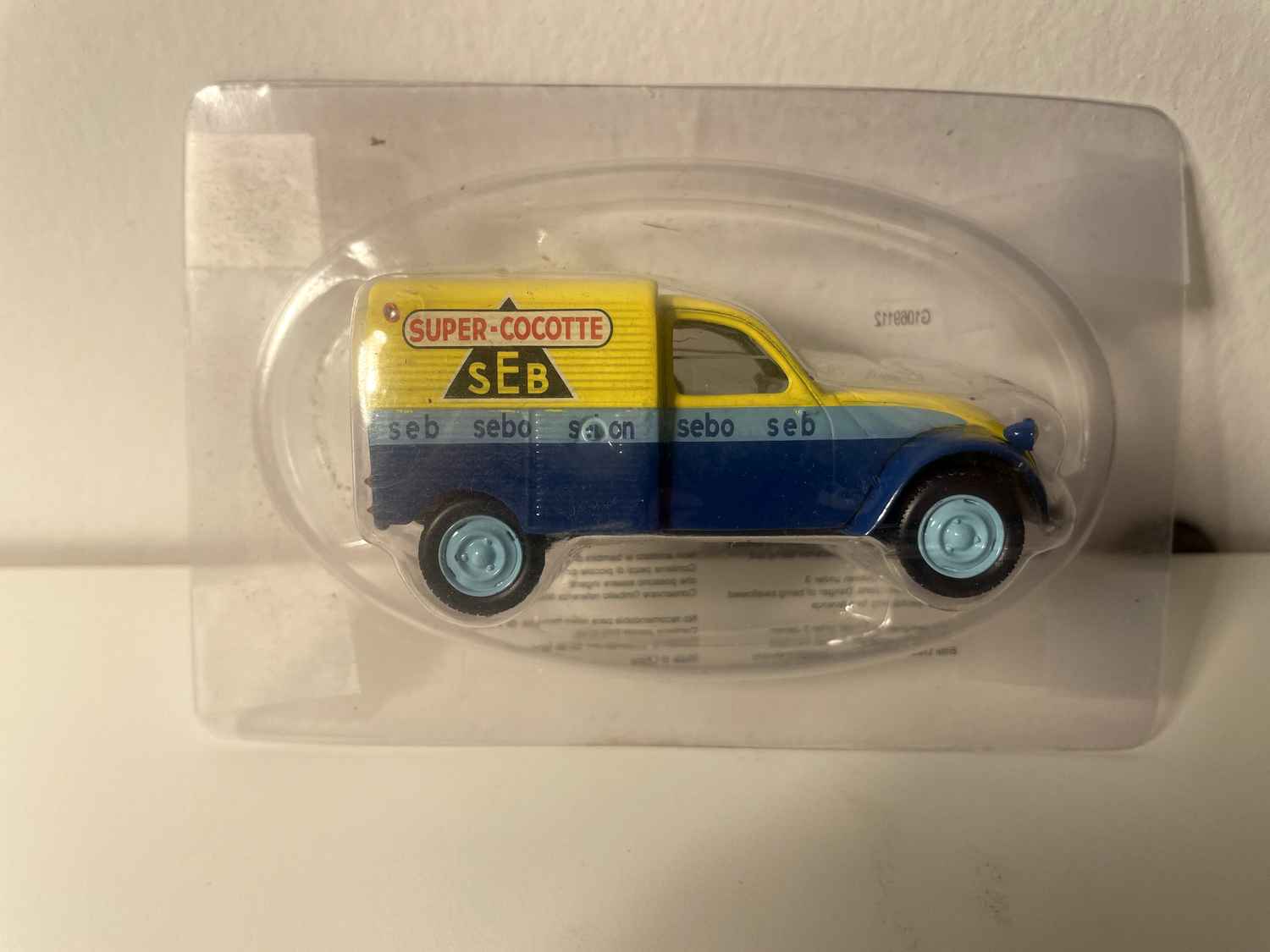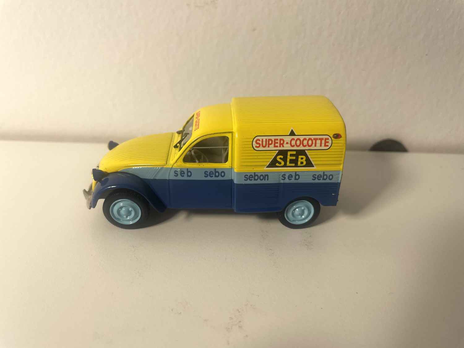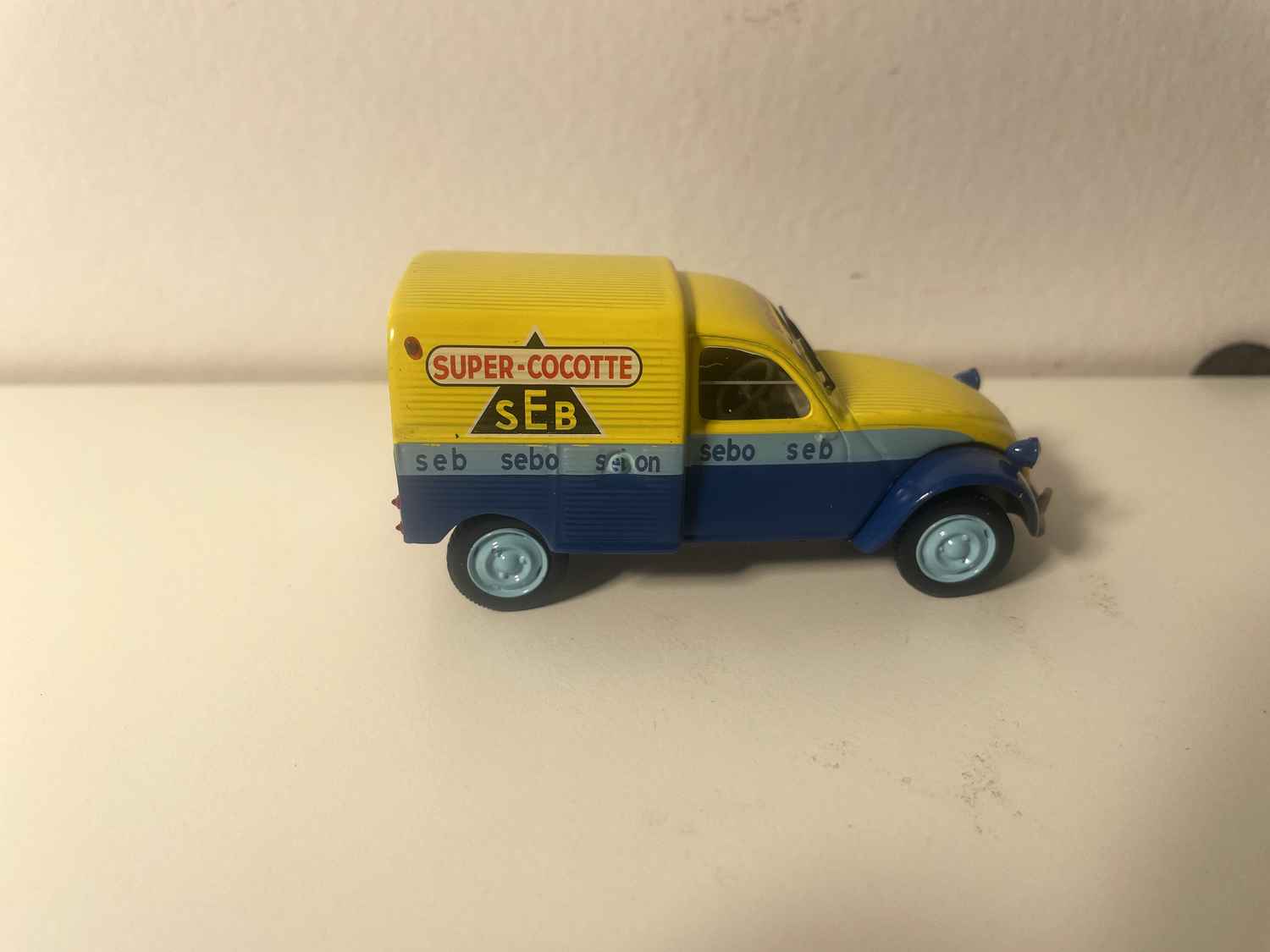 Voiture Miniature Citroën 2 CV AZU fourgonnette bleue et jaune avec publicité SEB (super cocotte) - Norev