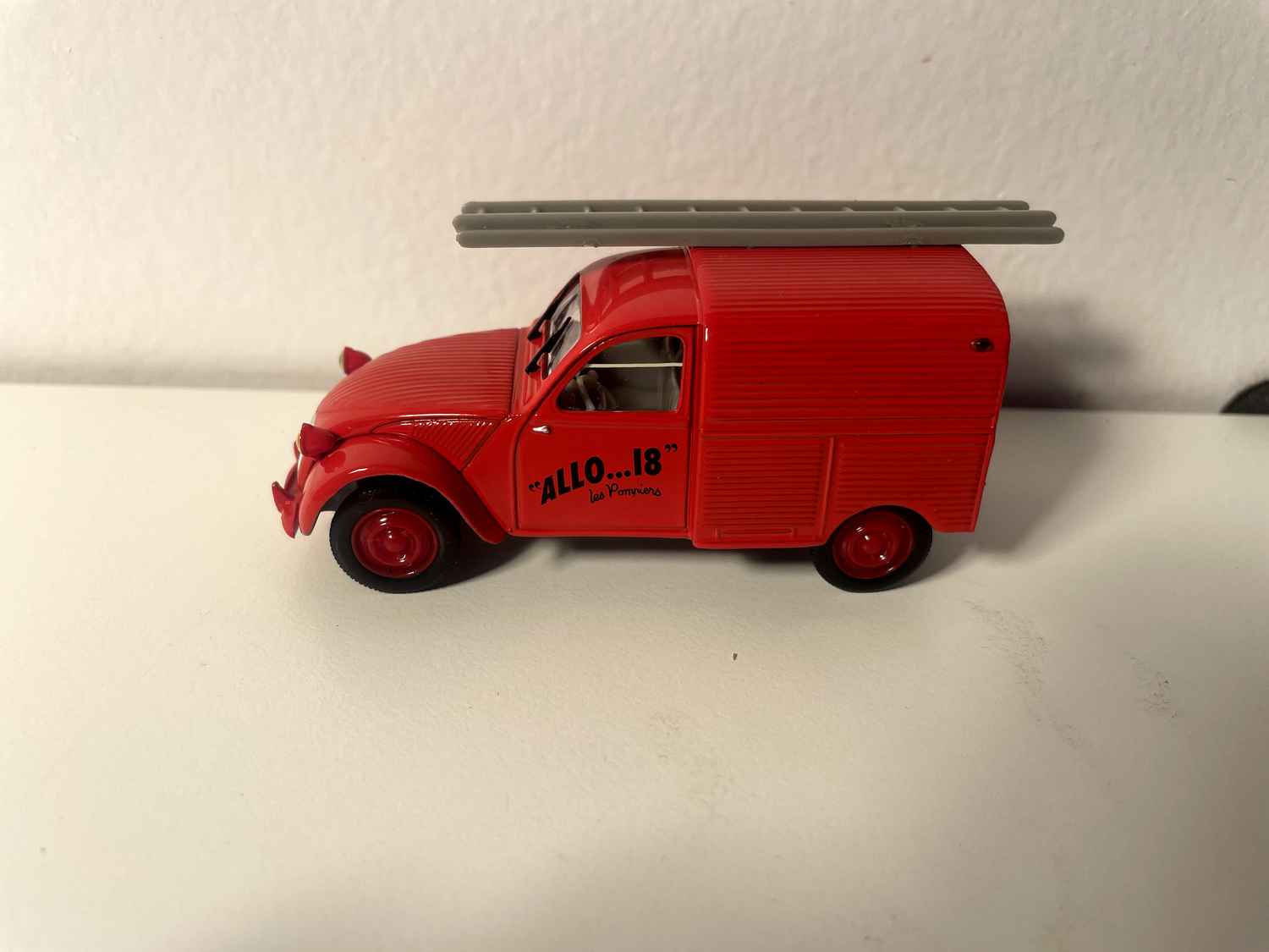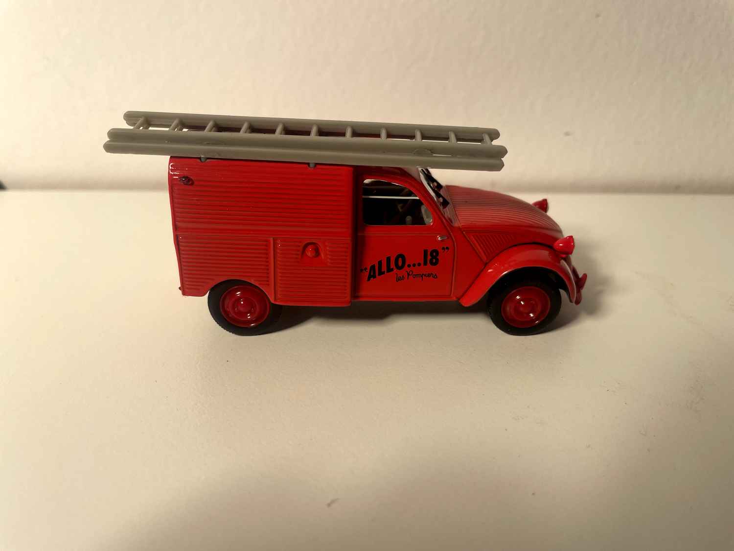Voiture Miniature Citroën 2 CV AZU fourgonnette rouge avec échelle "ALLO 18 les pompiers" - Norev (sous blister)