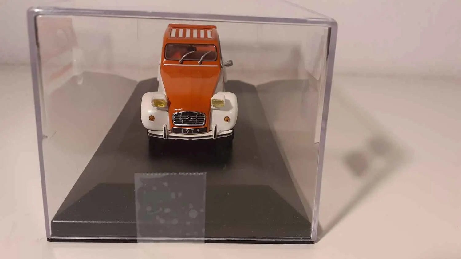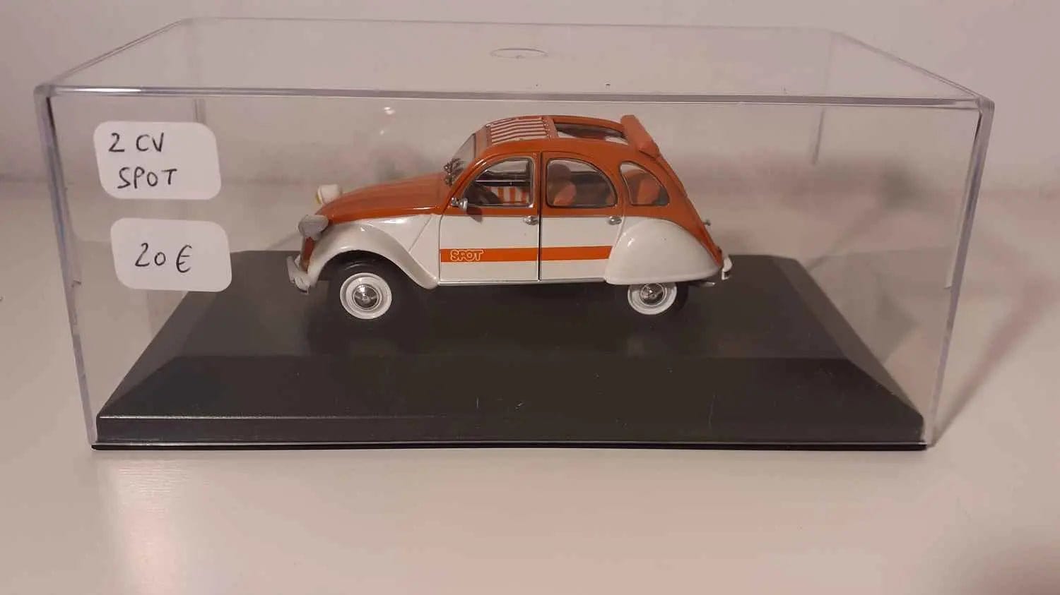 Voiture Miniature Citroën 2 CV Spot orange et blanche (boite plexi)