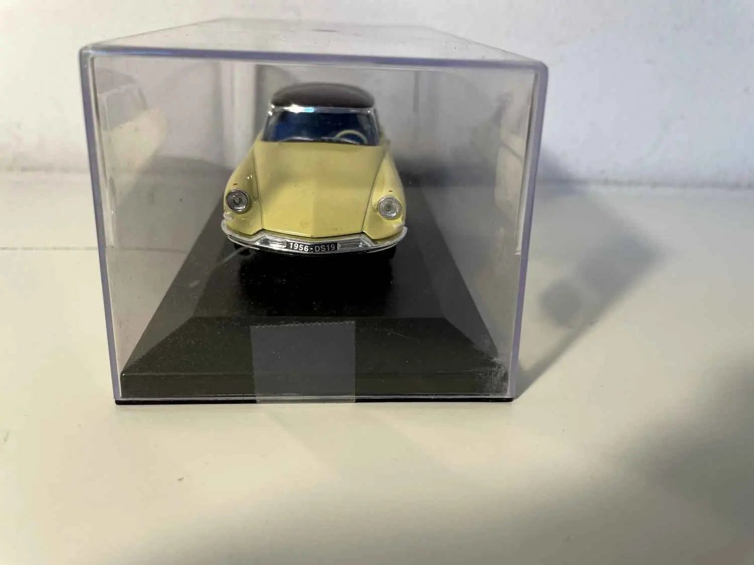 Voiture Miniature Citroën DS19 jaune et toit marron de 1955 salon de l'auto (boite plexi)