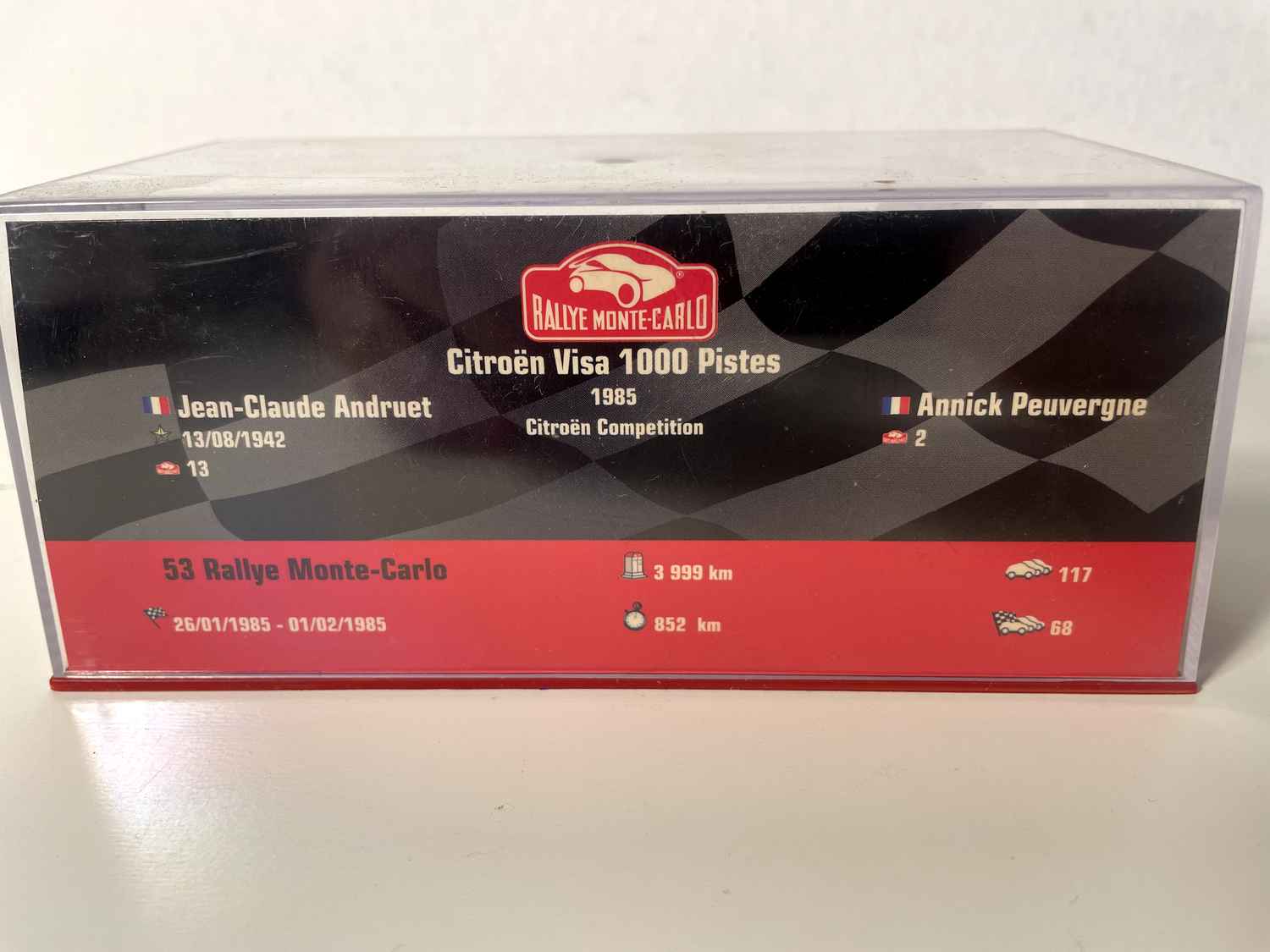 Cette Citroën Visa 1000 pistes du rallye de Monte-Carlo 1985 occupe une place particulière dans l'univers des miniatures de rallye. Elle représente l'âge d'or des petites françaises survitaminées, période faste où les constructeurs nationaux n'hésitaient pas à transformer leurs citadines en armes de compétition. Cette pièce s'harmonise parfaitement avec d'autres modèles emblématiques des années 1980.