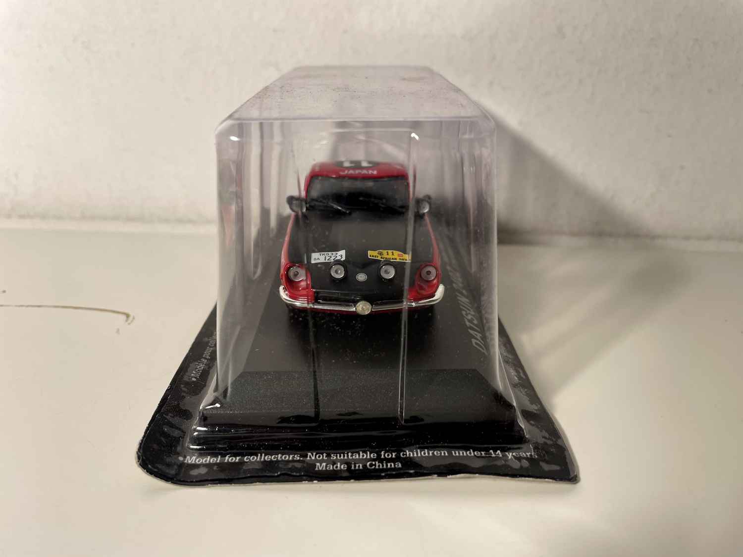 Voiture Miniature Datsun 240Z rouge et noire numéro 11 (safari rallye de 1971)
