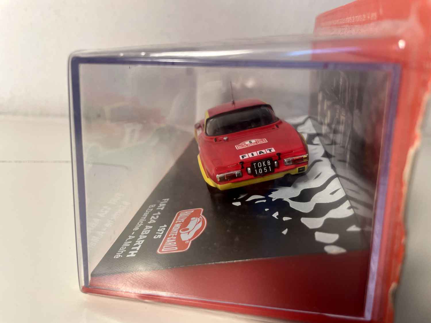 Voiture Miniature Fiat 124 Abarth rouge et jaune numéro 6 - rallye de Monté-Carlo de 1975
