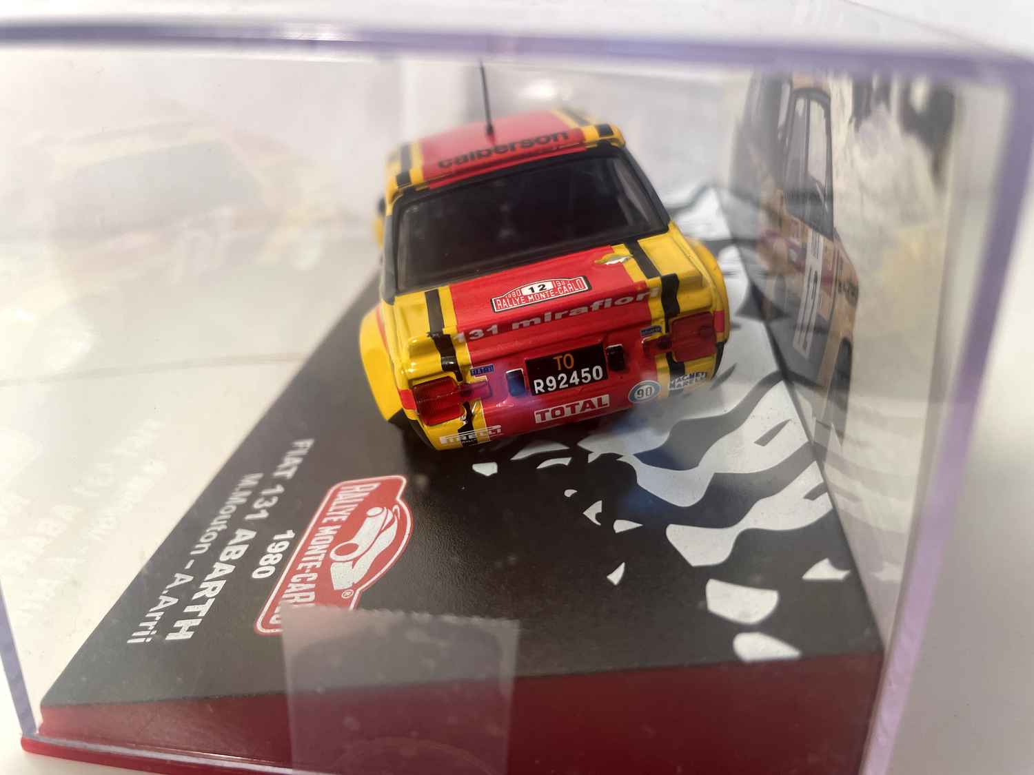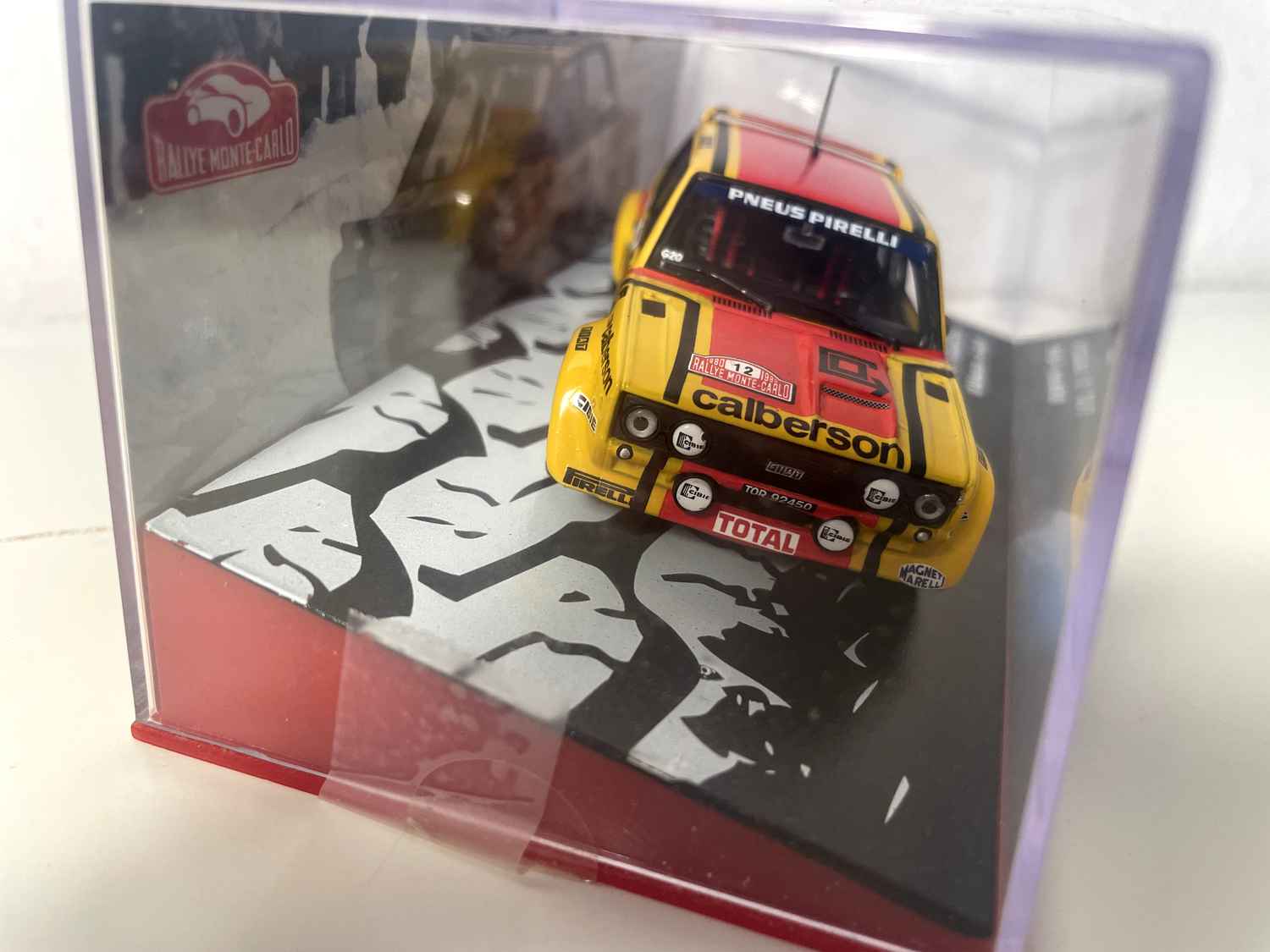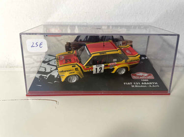 Voiture Miniature Fiat 131 Abarth jaune, rouge et noire numéro 12 - rallye de Monté-Carlo de 1980