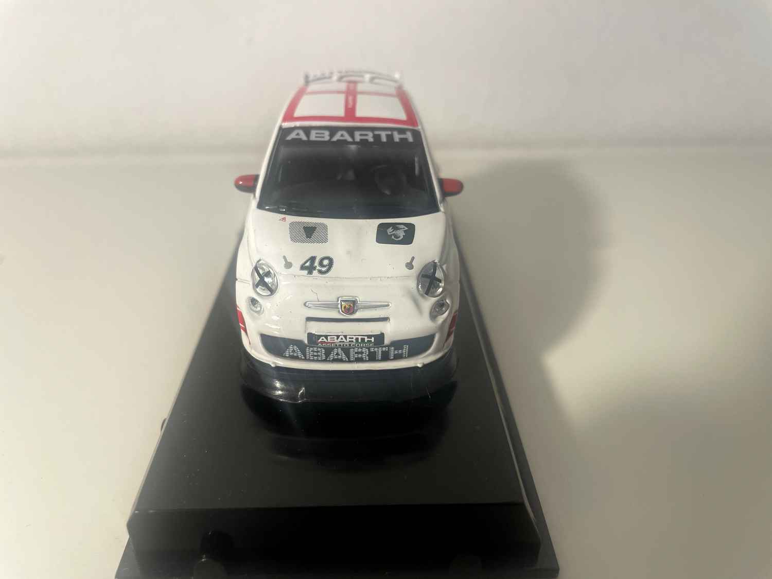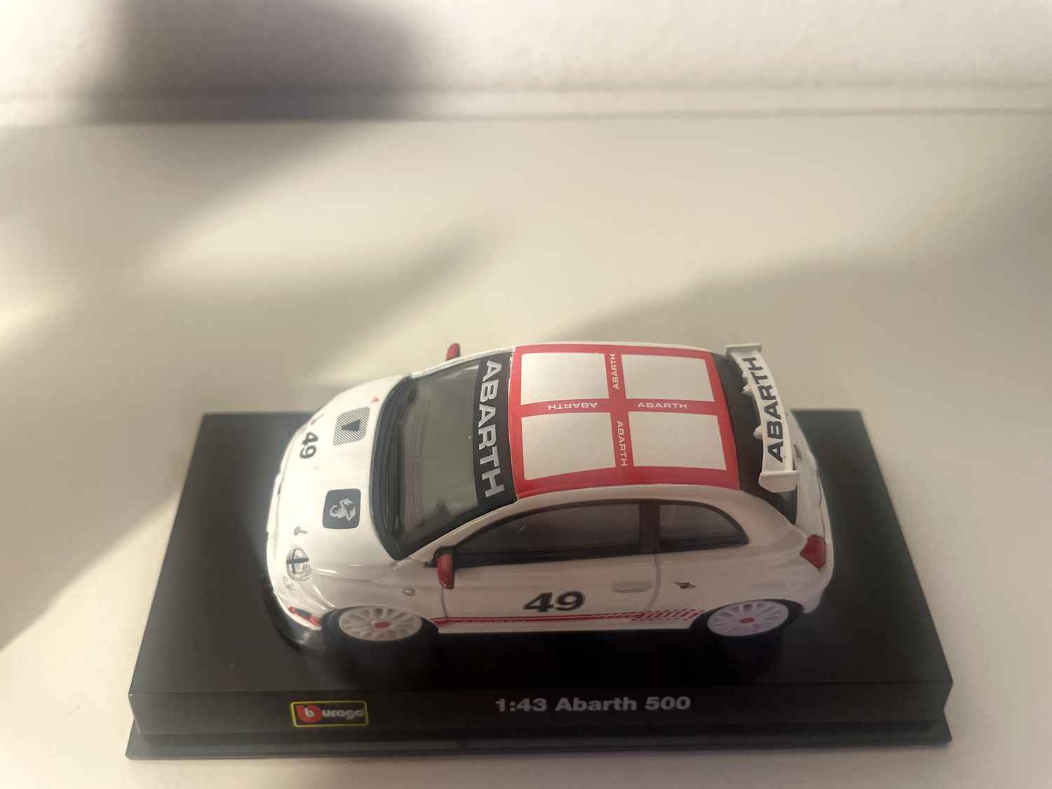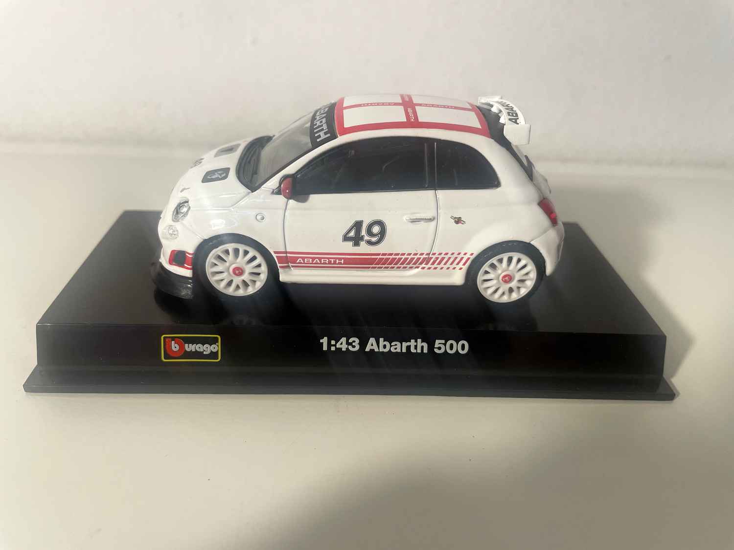 Voiture Miniature Fiat Abarth 500 blanche et toit en damiers blancs et rouge - numéro 49 - Burago