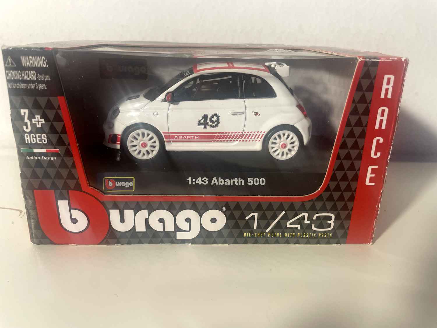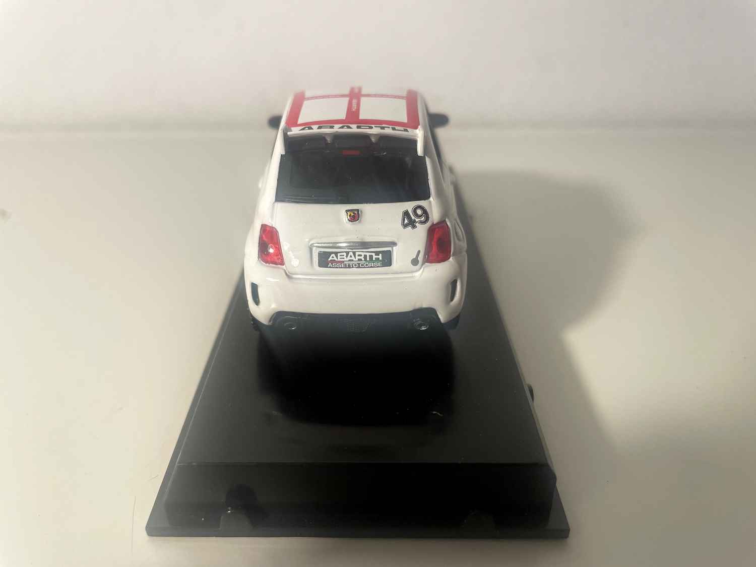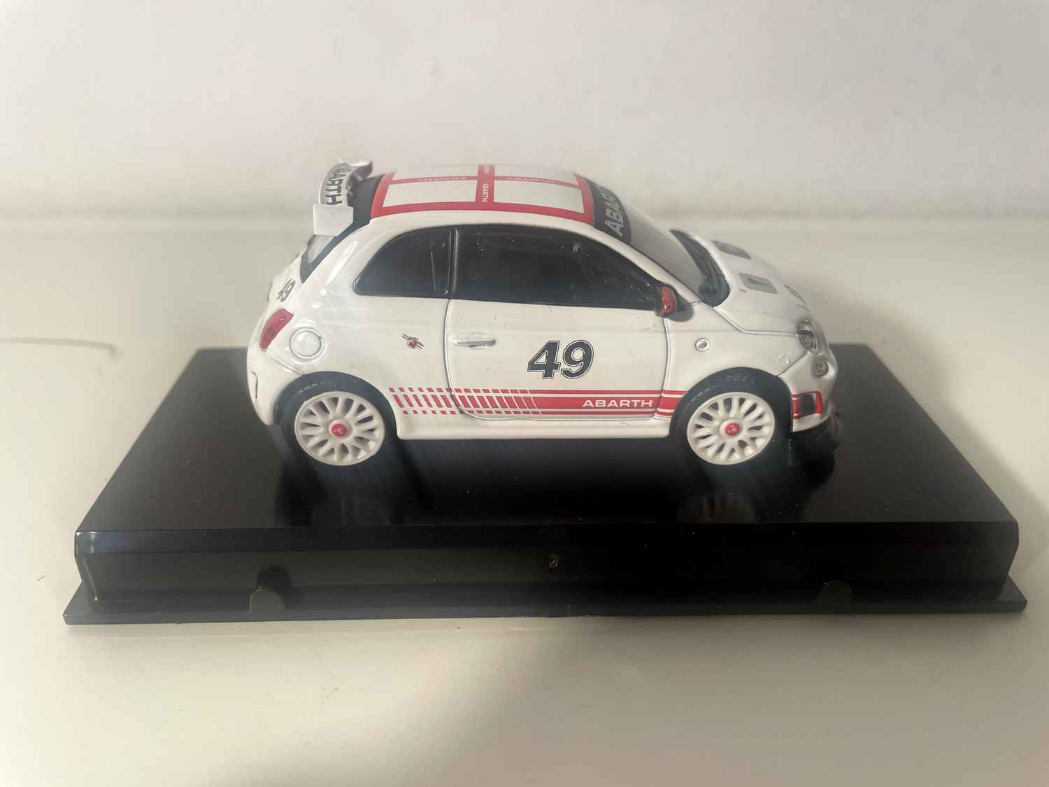 Voiture Miniature Fiat Abarth 500 blanche et toit en damiers blancs et rouge - numéro 49 - Burago