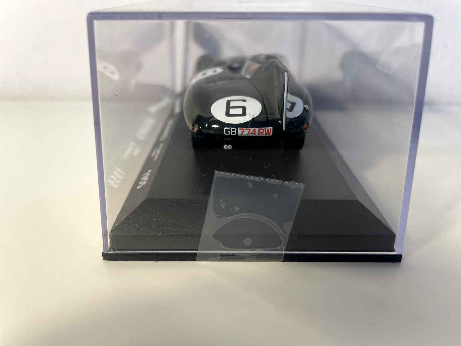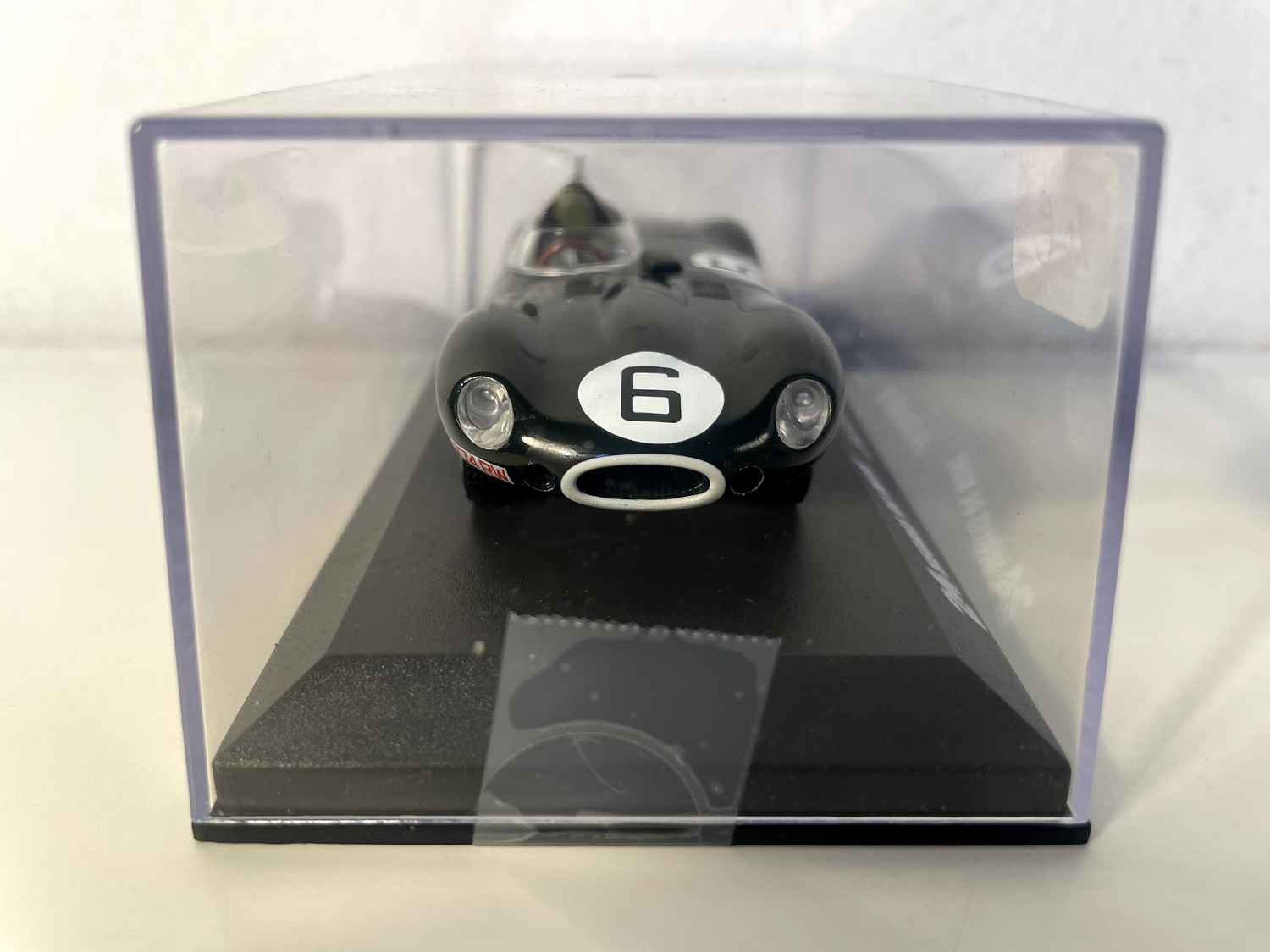 Cette miniature de la Jaguar D-Type verte numéro 6 reproduit fidèlement l'une des voitures les plus emblématiques de l'histoire des 24 Heures du Mans. Pilotée par le duo britannique Mike Hawthorn et Ivor Bueb lors de l'édition tragique de 1955, cette réplique capture toute l'essence de cette voiture de légende qui marqua à jamais l'histoire de l'endurance automobile.
