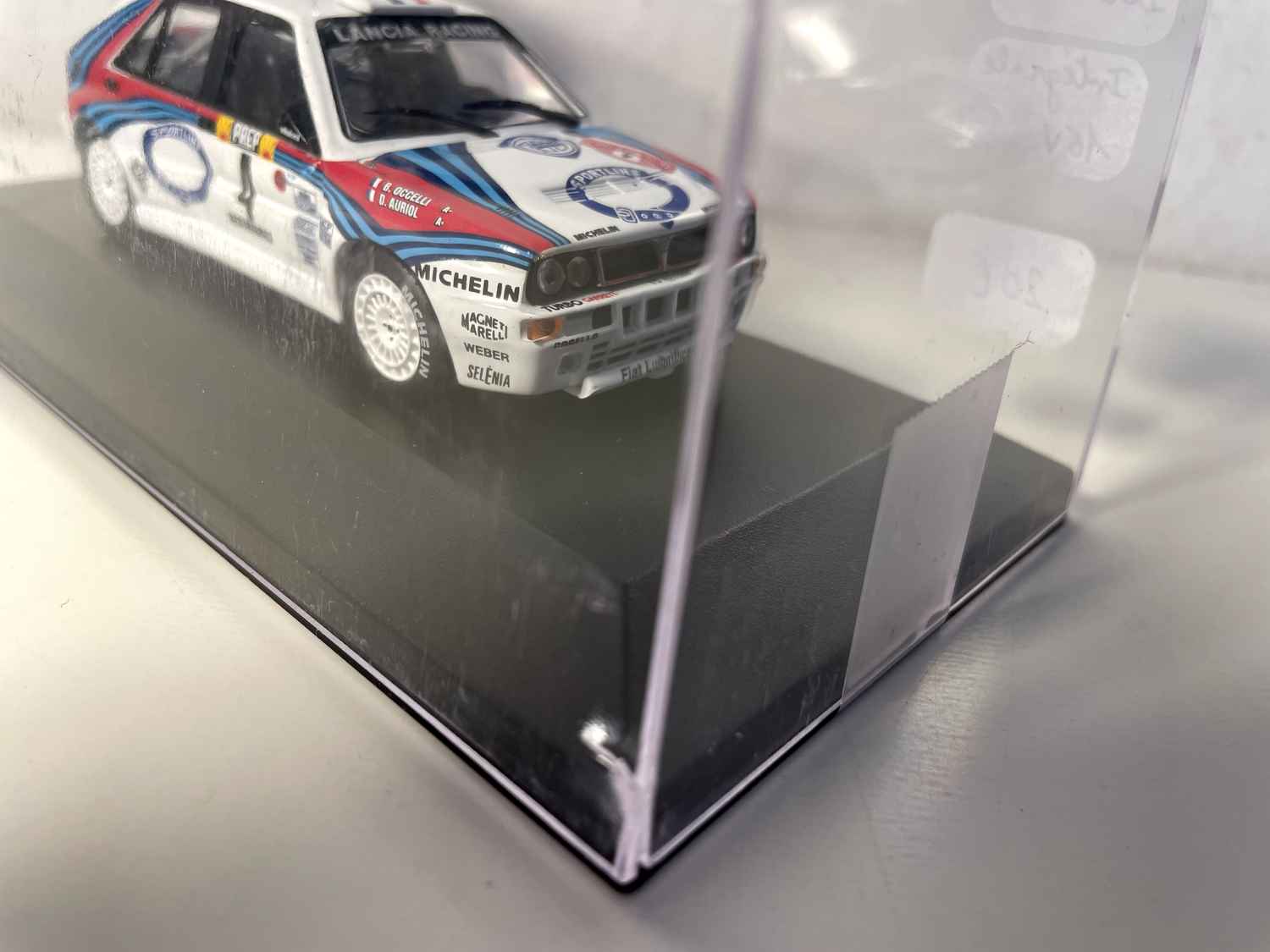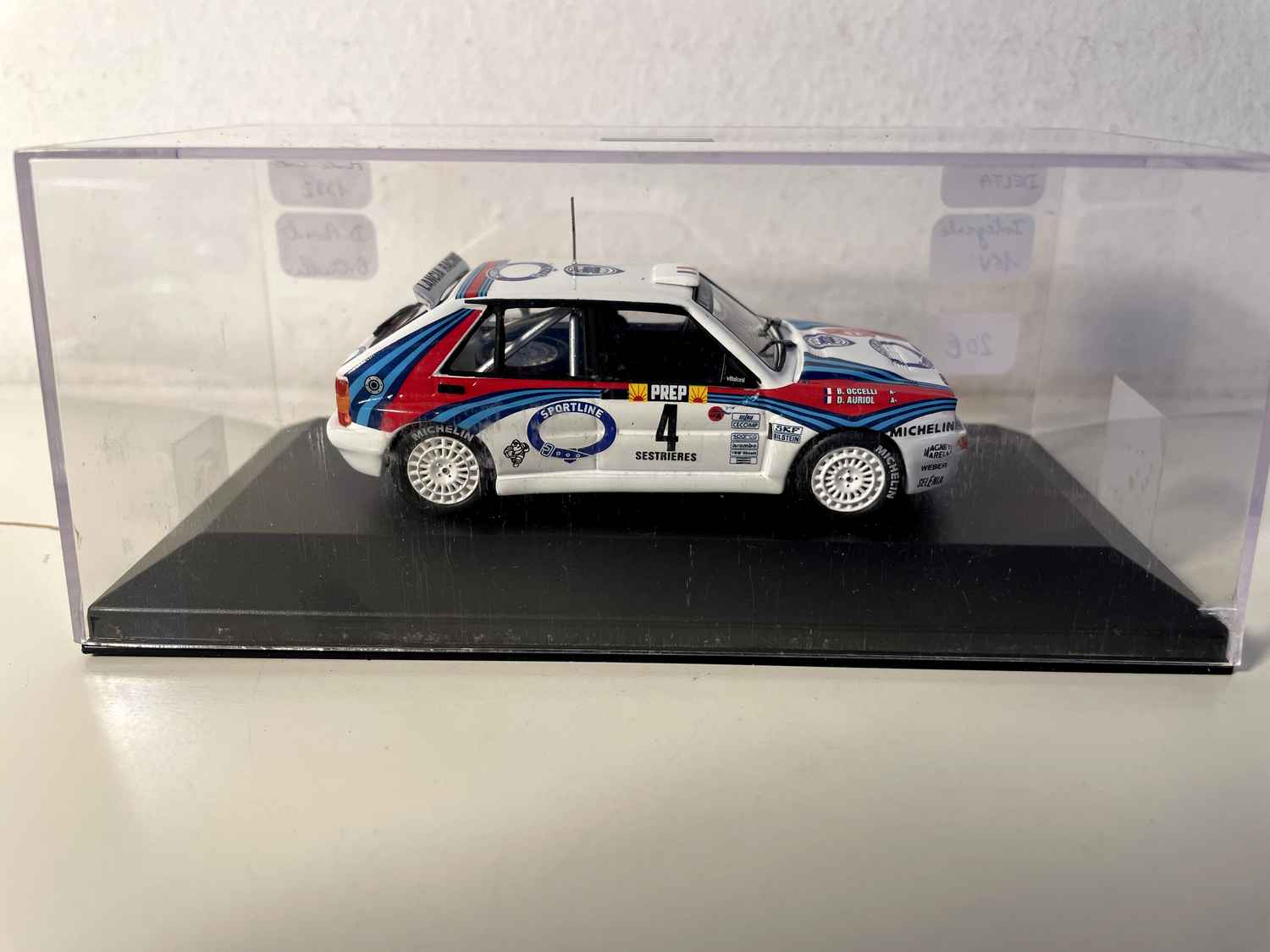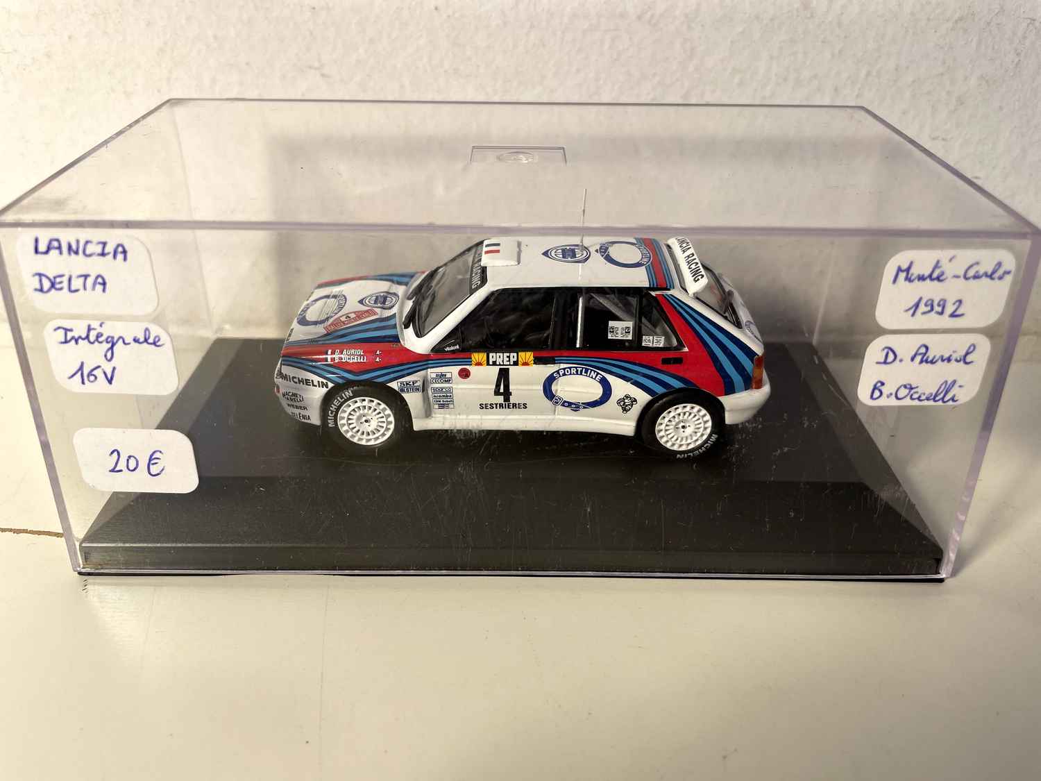 Voiture Miniature Lancia Delta Intégrale 16V blanche, rouge et bleue numéro 4 - Rallye de Monté-Carlo de 1992