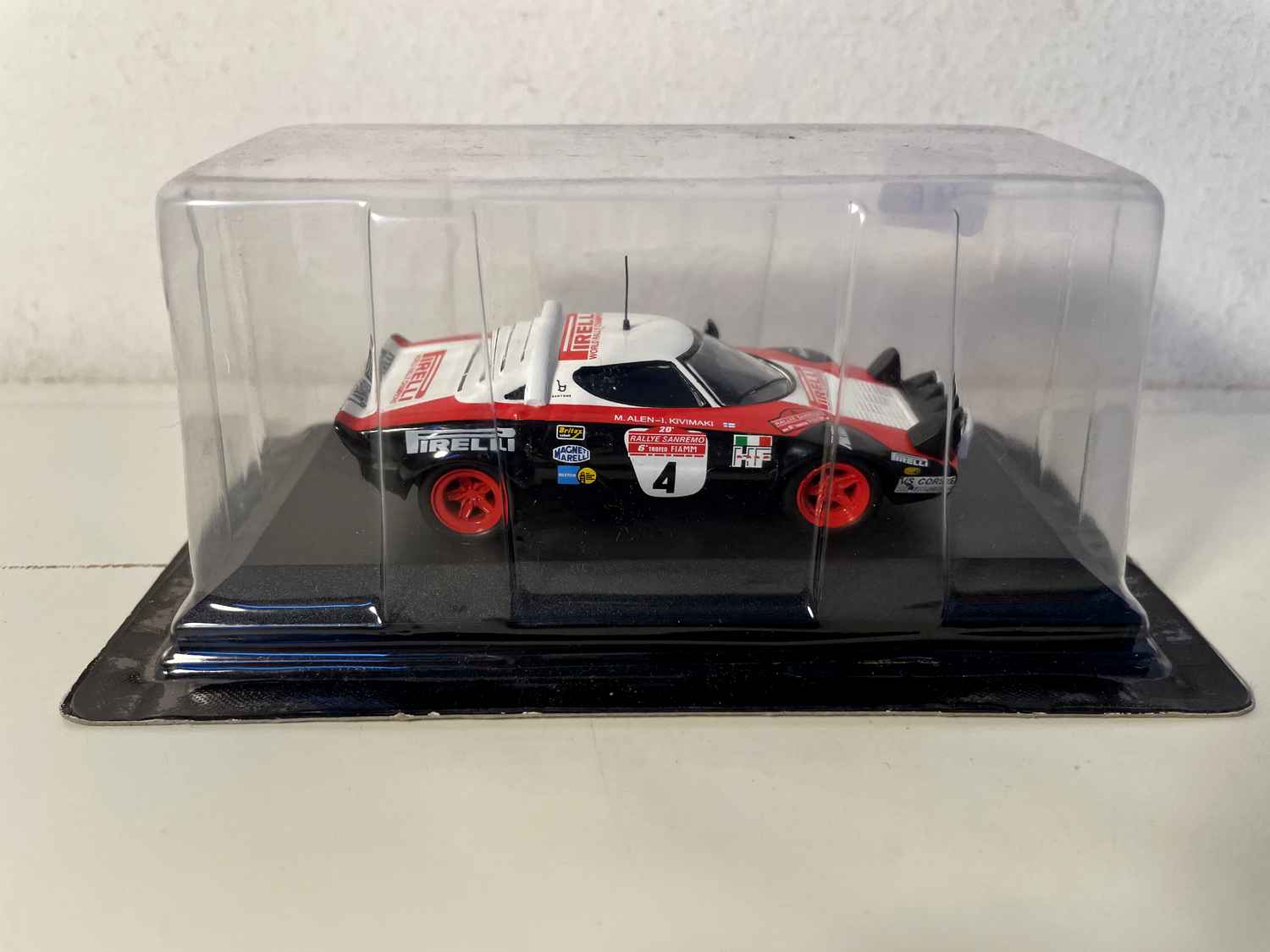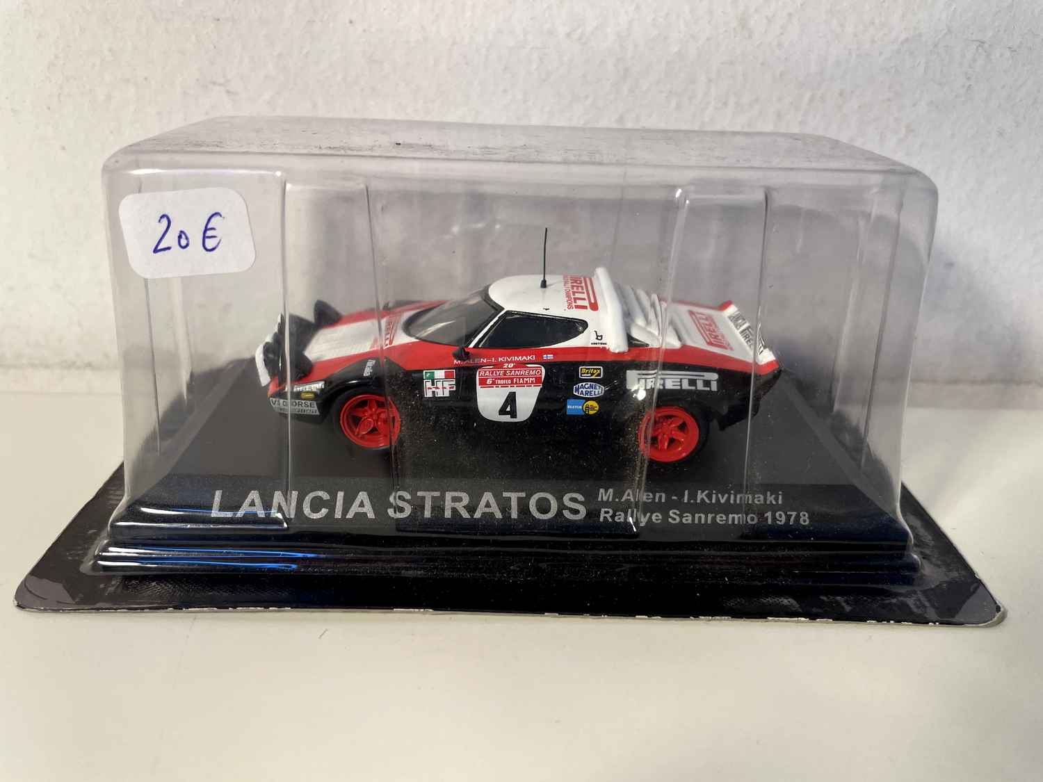 Voici une Lancia Stratos dans sa livrée mythique de rallye, reproduite fidèlement dans cette miniature d'exception. Cette réplique de la voiture numéro 4 qui a participé au rallye de San-Rémo de 1978, pilotée par le duo légendaire M. Alen et I. Kivimaki, incarne toute la fougue et l'esprit de compétition des années 70.