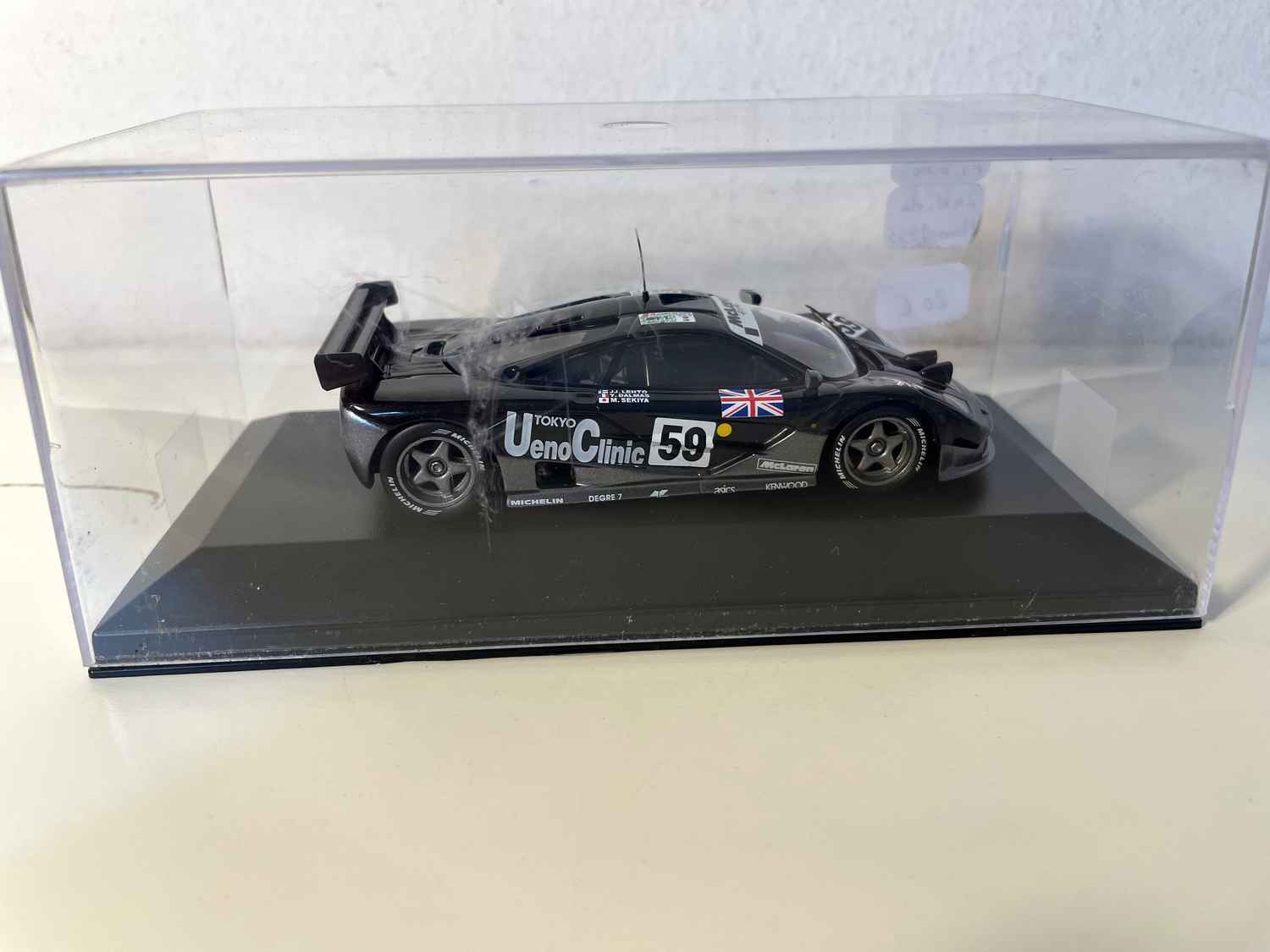 Voiture Miniature McLaren F1 GTR noire numéro 59 (24 heures du Mans de 1995)- voiture rajoutée sur socle + boite plexi