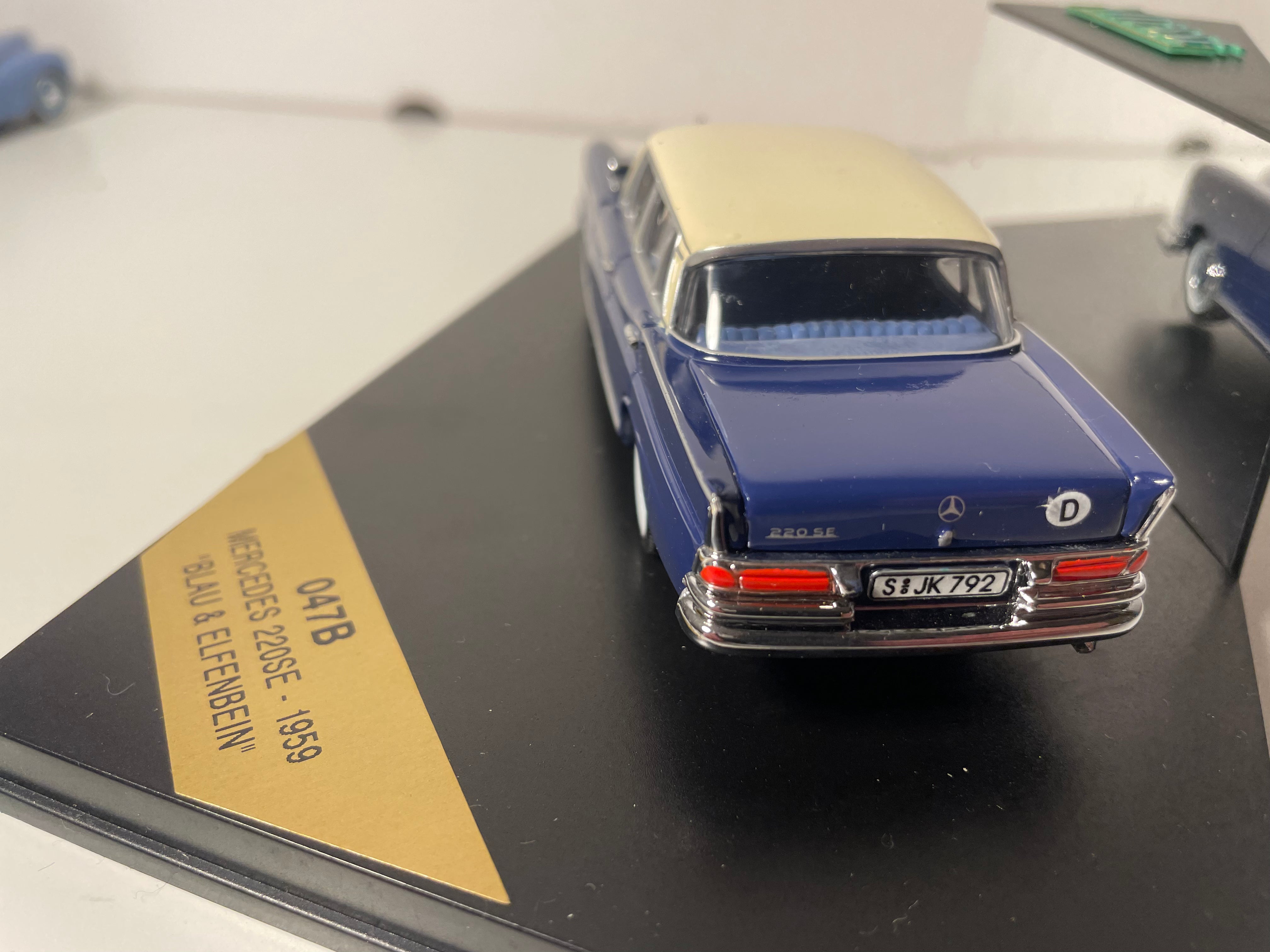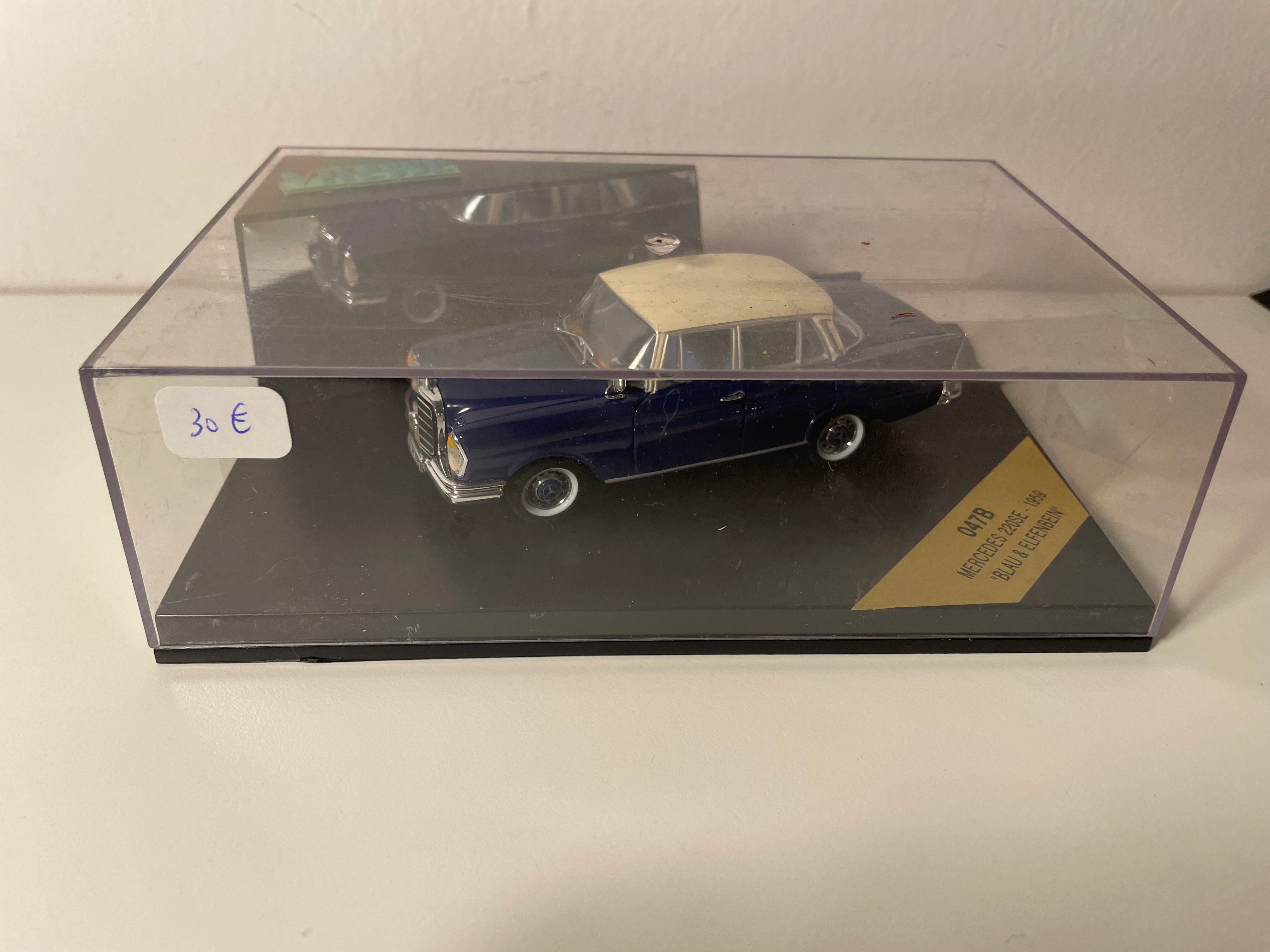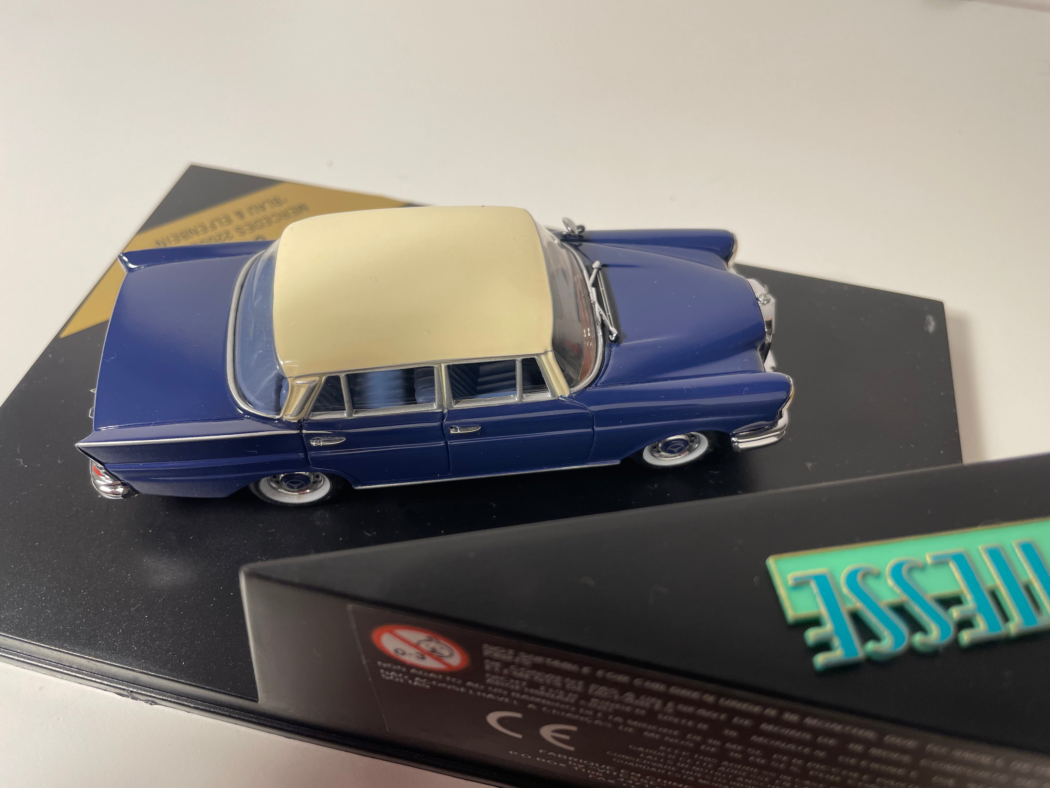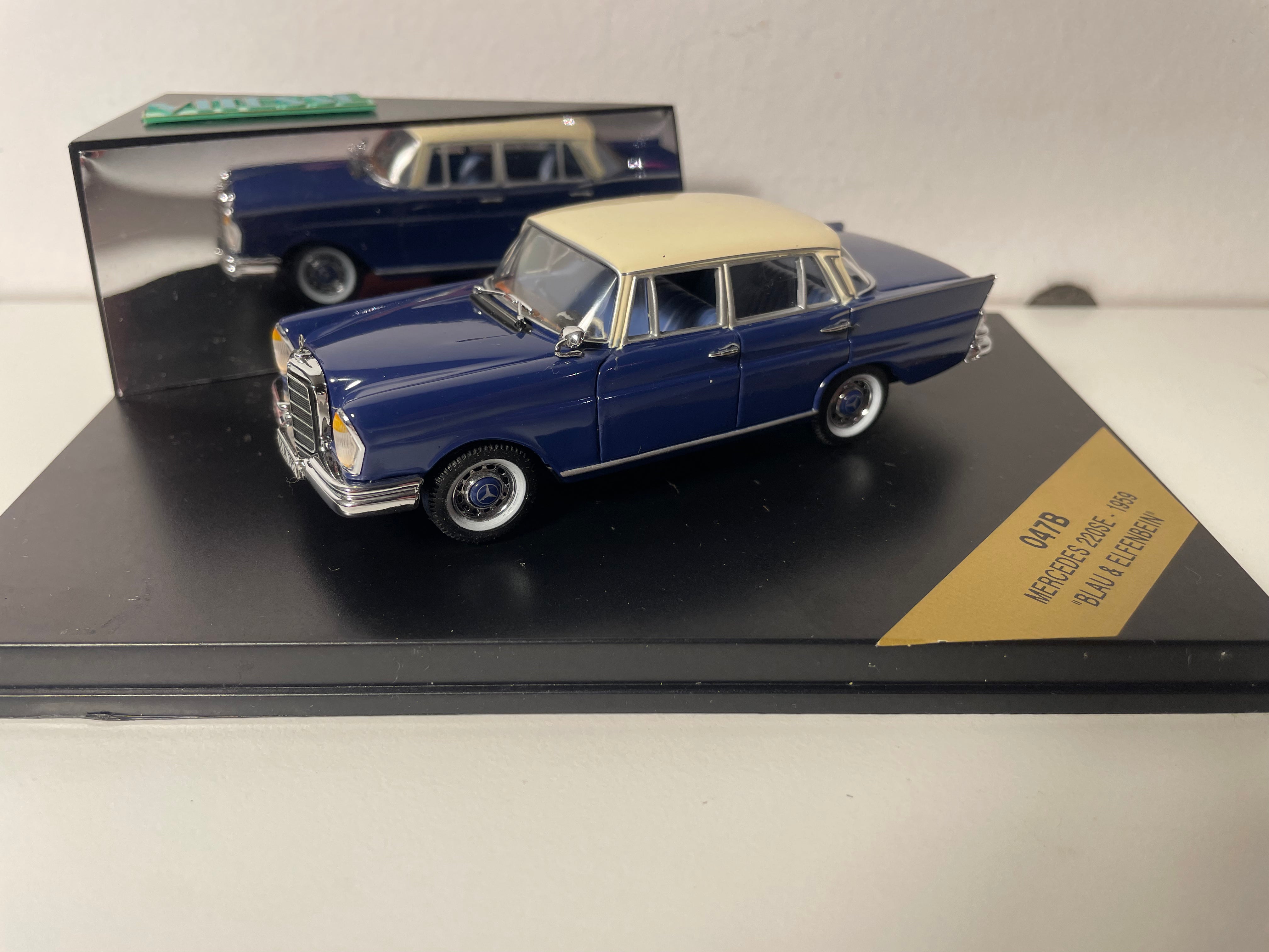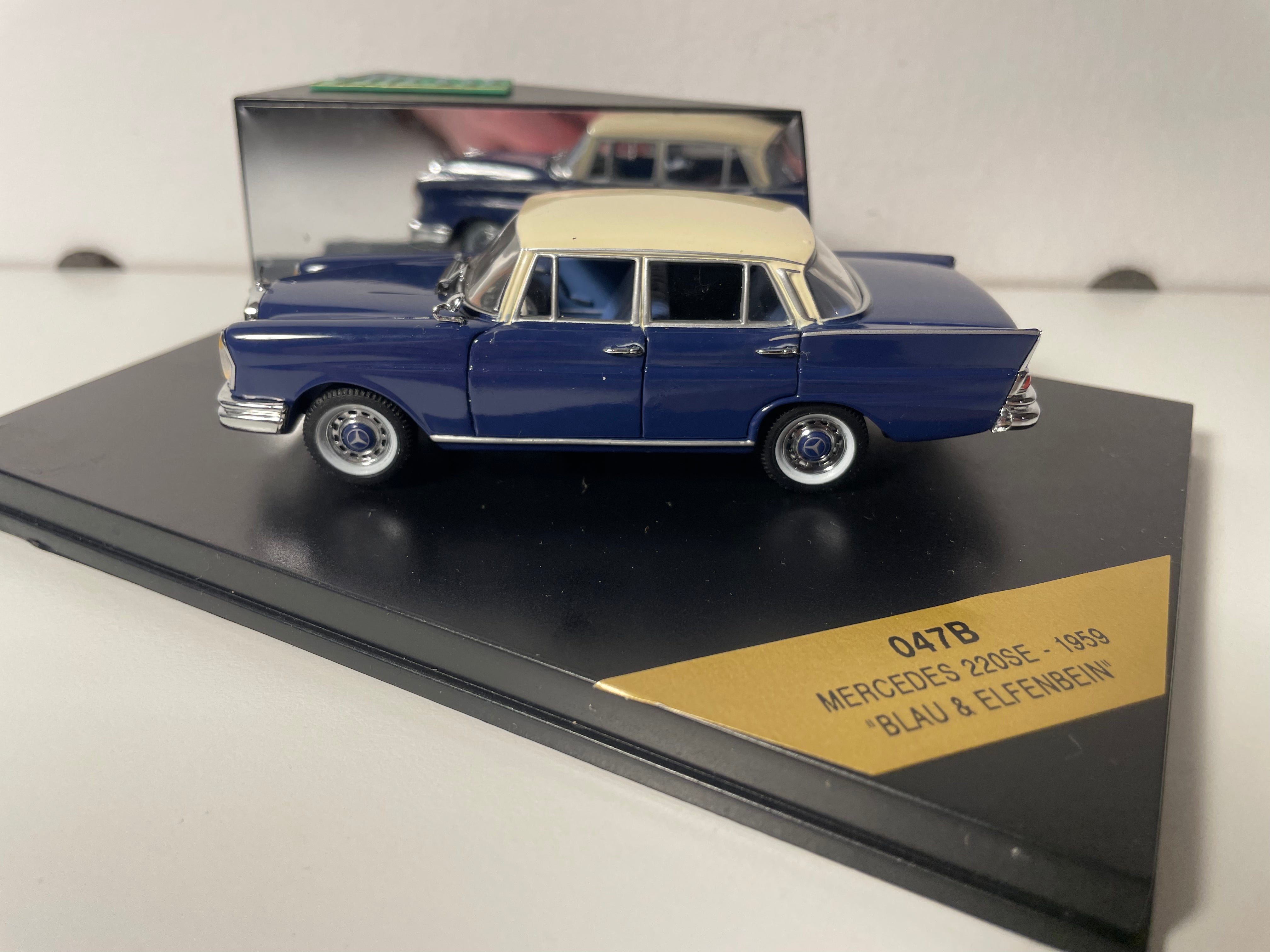 Voiture Miniature Mercedes 220SE bleue et toit couleur crème de 1959 - VITESSE référence 047B (boite rectangle)