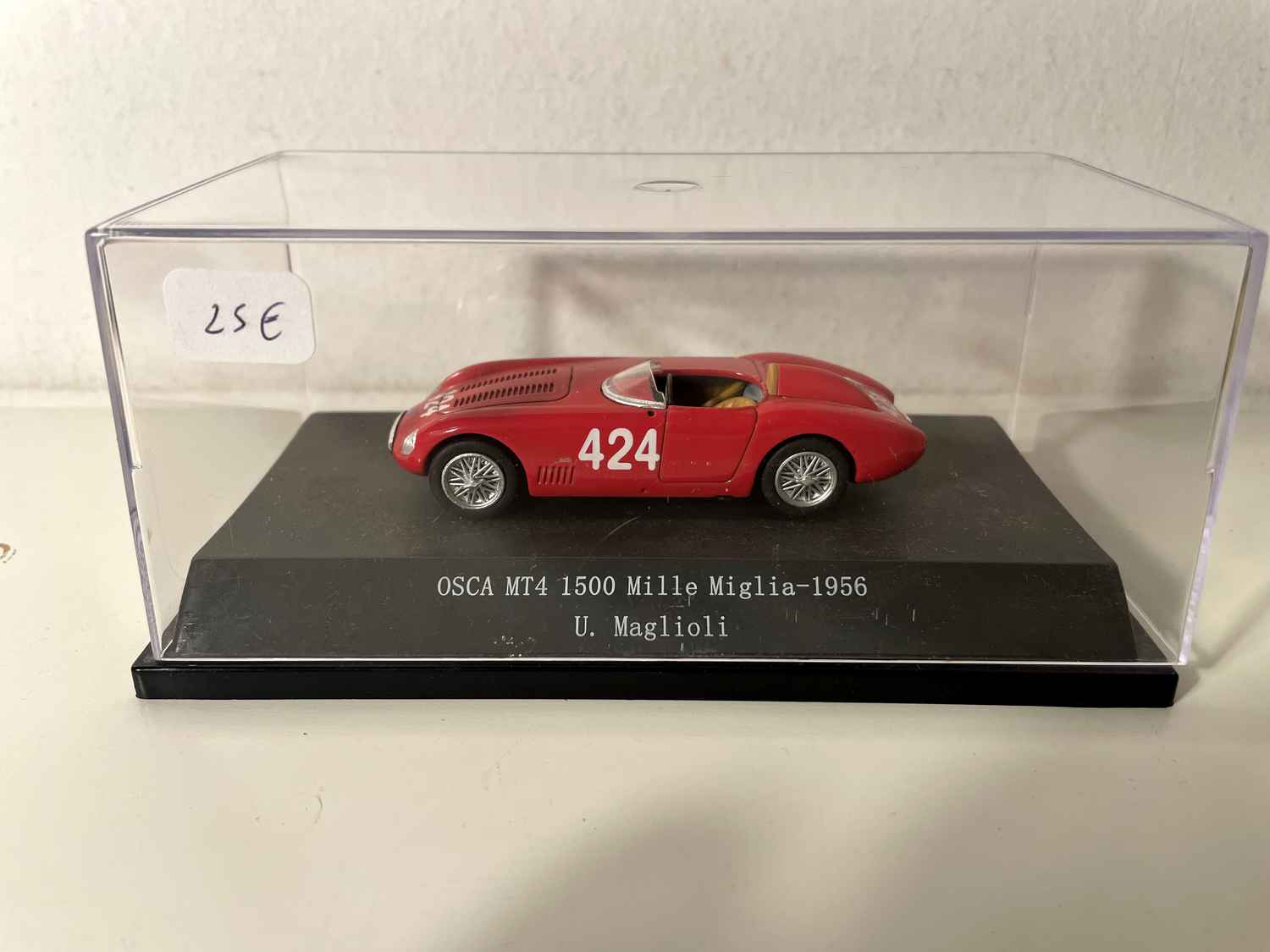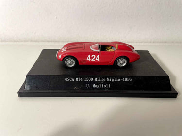 La Osca MT4 1500 de 1956 est une pépite de l'âge d'or du sport automobile italien. Cette miniature rouge frappée du numéro 424 reproduit fidèlement l'exemplaire qui participa aux mythiques Mille Miglia de 1956 sous la conduite d'Umberto Maglioli, pilote d'exception de cette époque dorée.