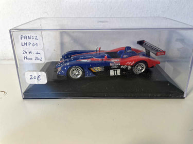 Voiture Miniature Panoz LMP01 bleue et rouge numéro 11 (24 heures du Mans de 2002) - voiture rajoutée sur socle + boite plexi