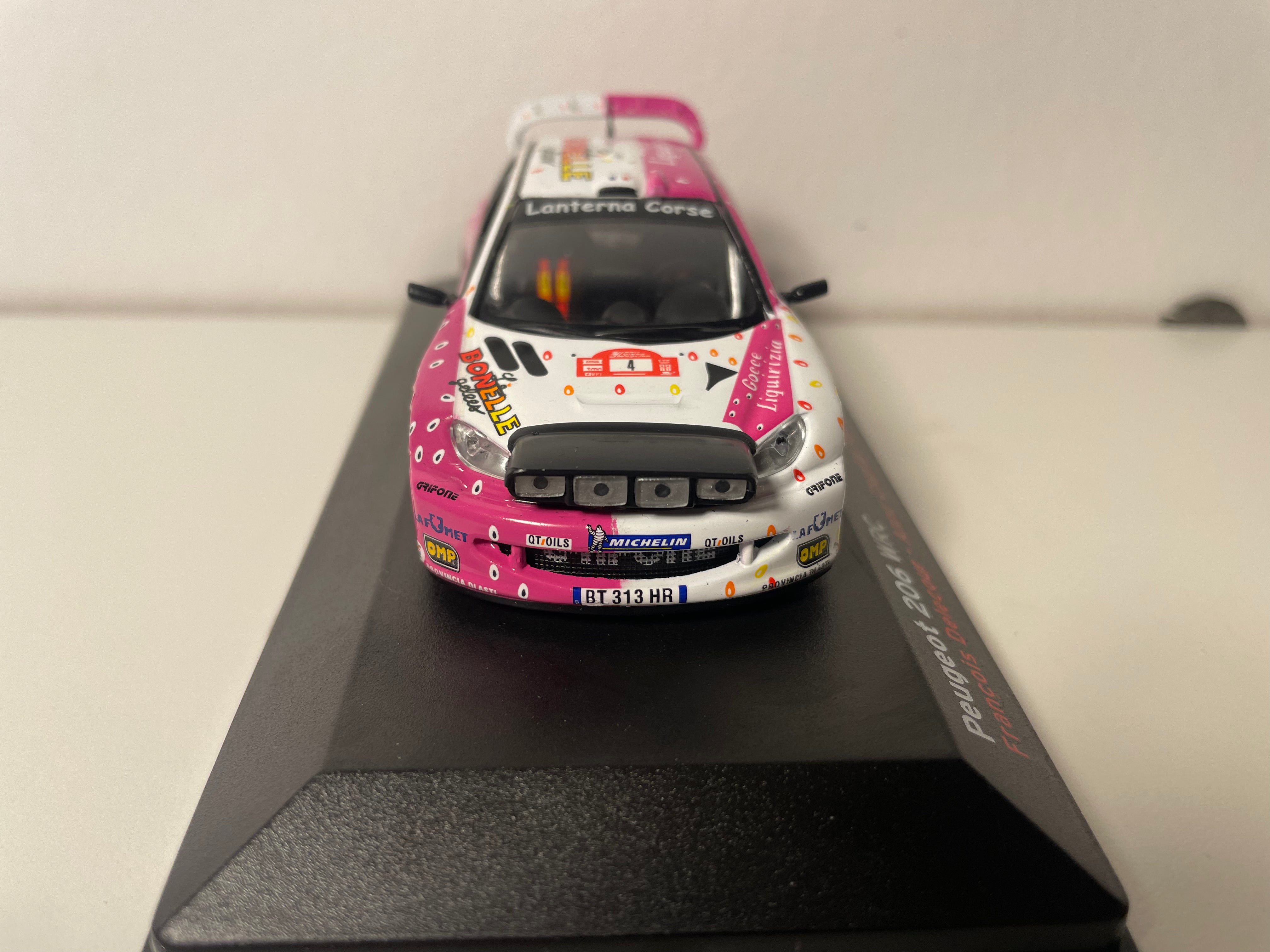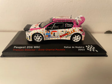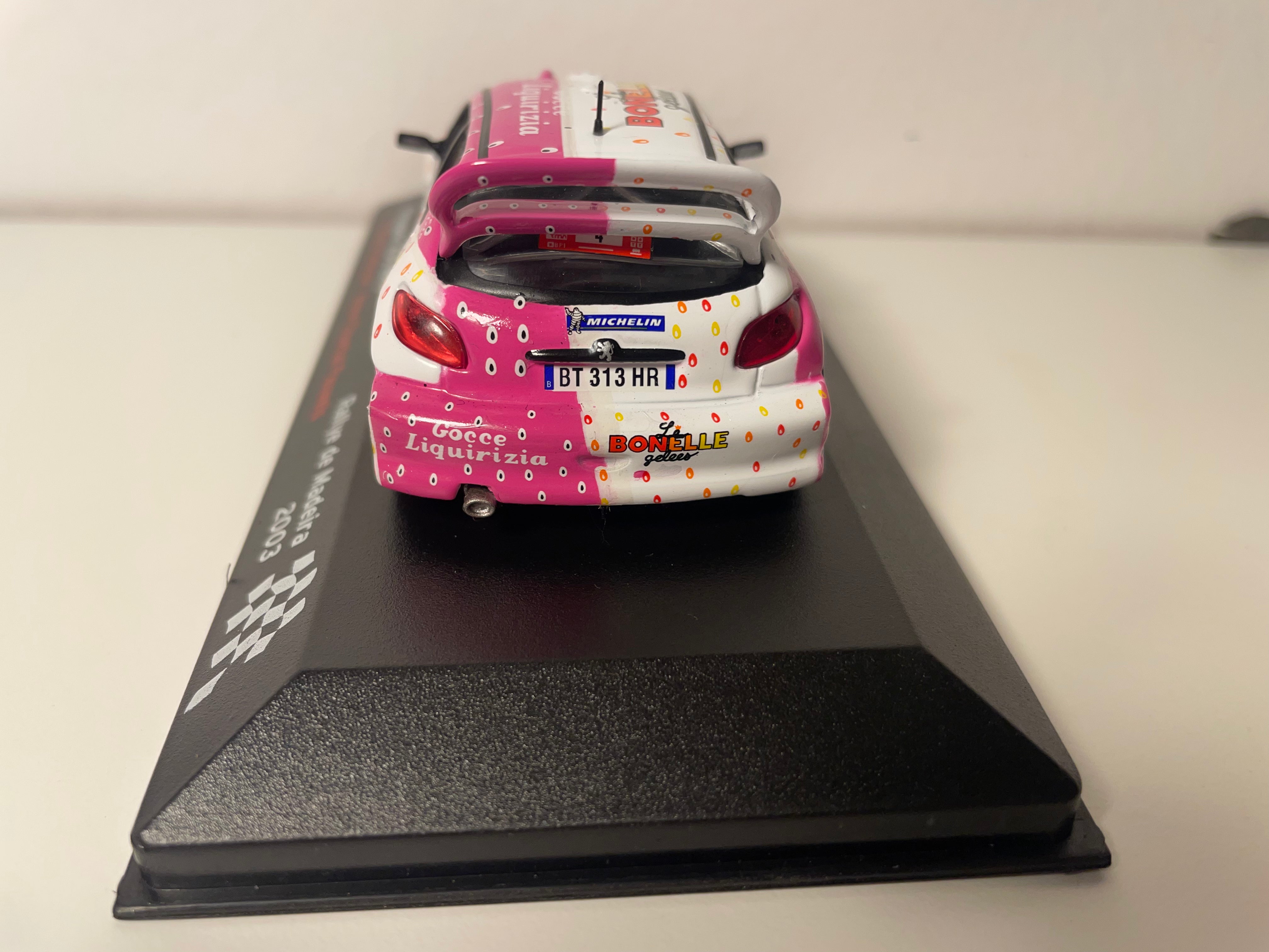 Voiture Miniature Peugeot 206 WRC blanche et rose numéro 4 - Rallye de Madeire 2003