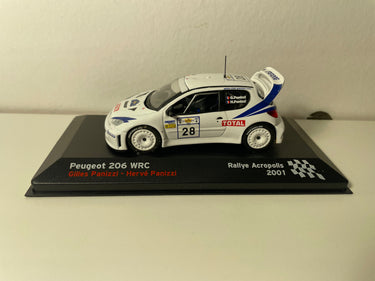Découvrez cette miniature Peugeot 206 WRC aux couleurs du Rallye Acropolis 2001, pilotée par l'équipage français Gilles et Hervé Panizzi. Cette reproduction fidèle capture l'essence de l'une des voitures de rallye les plus emblématiques des années 2000, arborant fièrement le numéro 28 sur sa carrosserie blanche immaculée.