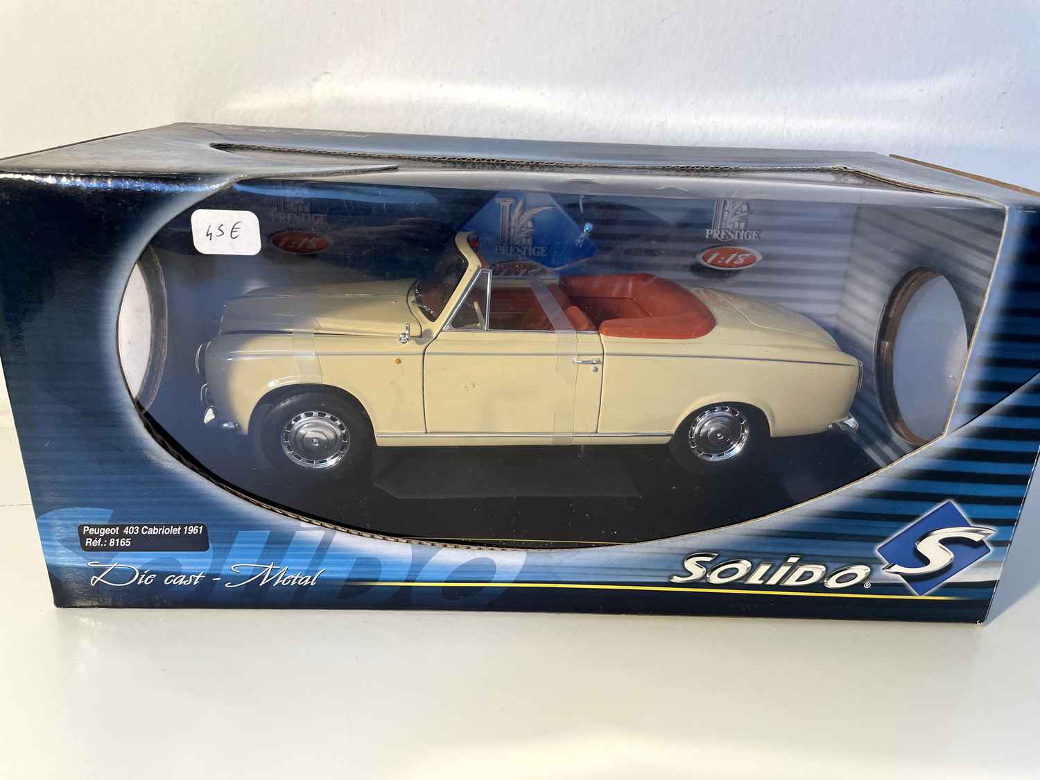 Découvrez cette magnifique miniature Peugeot 403 cabriolet marron clair de 1961, réalisée avec un soin exceptionnel par Solido à l'échelle 1/18ème. Cette reproduction fidèle capture toute l'élégance et le raffinement de l'une des voitures françaises les plus emblématiques des années 1960.