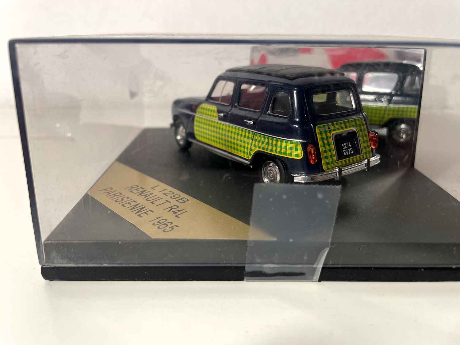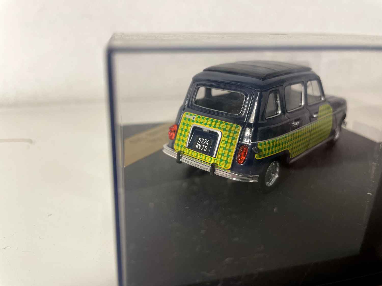 Voiture Miniature Renault 4L Parisienne bleue foncée et avec damiers verts et jaunes de 1965 - Vitesse référence L129B (boite carrée)