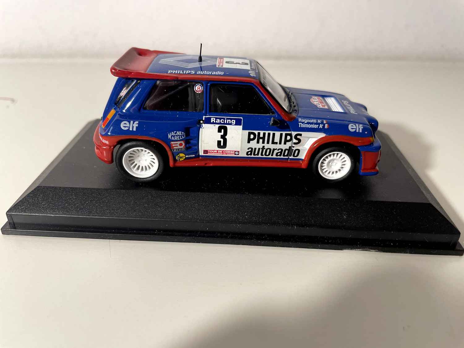 Voiture Miniature Renault 5 maxi turbo bleue, blanche et rouge numéro - Tour de Corse de 1985