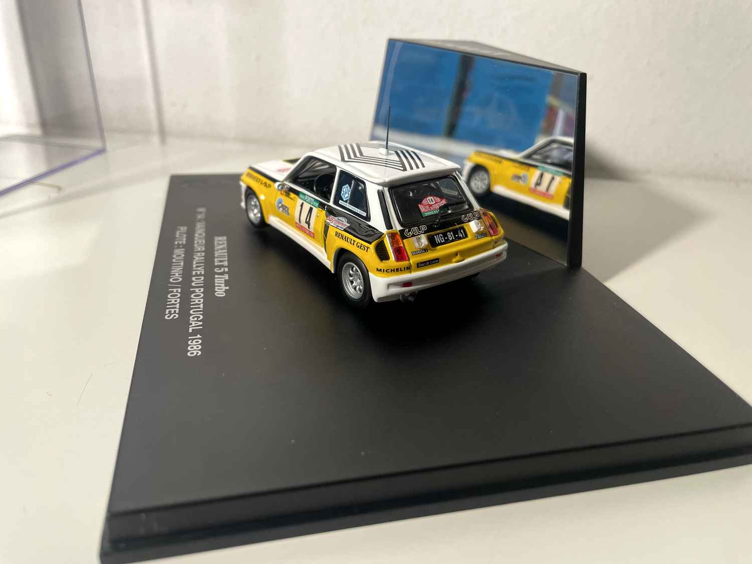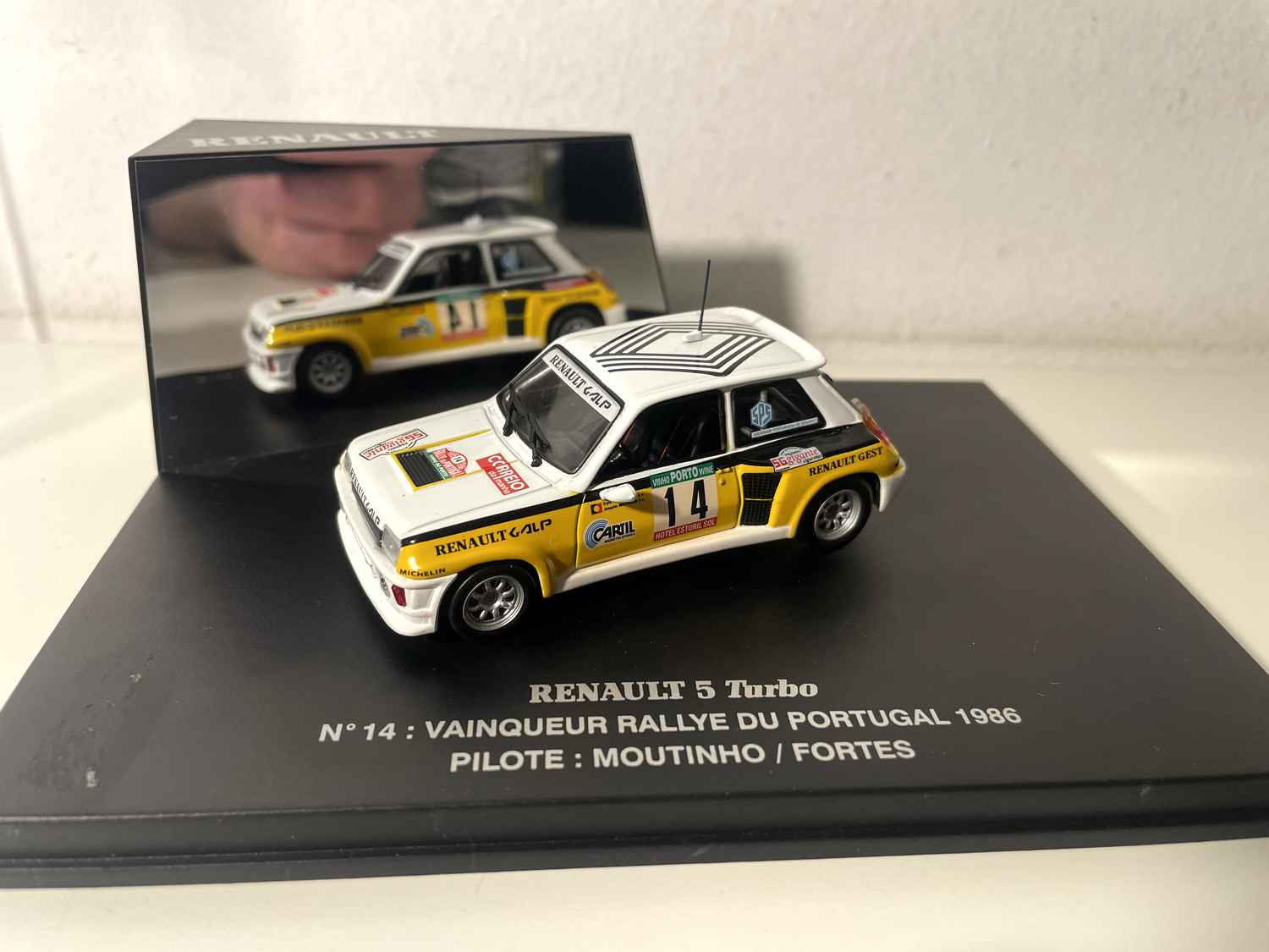 Cette miniature Renault 5 Turbo aux couleurs éclatantes blanc et jaune arbore fièrement le numéro 14, immortalisant la participation de l'équipage Moutinho/Fortes au rallye du Portugal 1986. Cette reproduction fidèle capture l'essence de l'une des voitures de rallye les plus emblématiques des années 80, période dorée du sport automobile français.