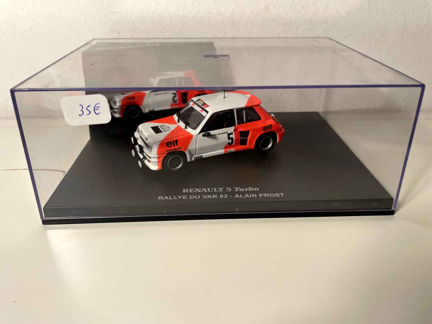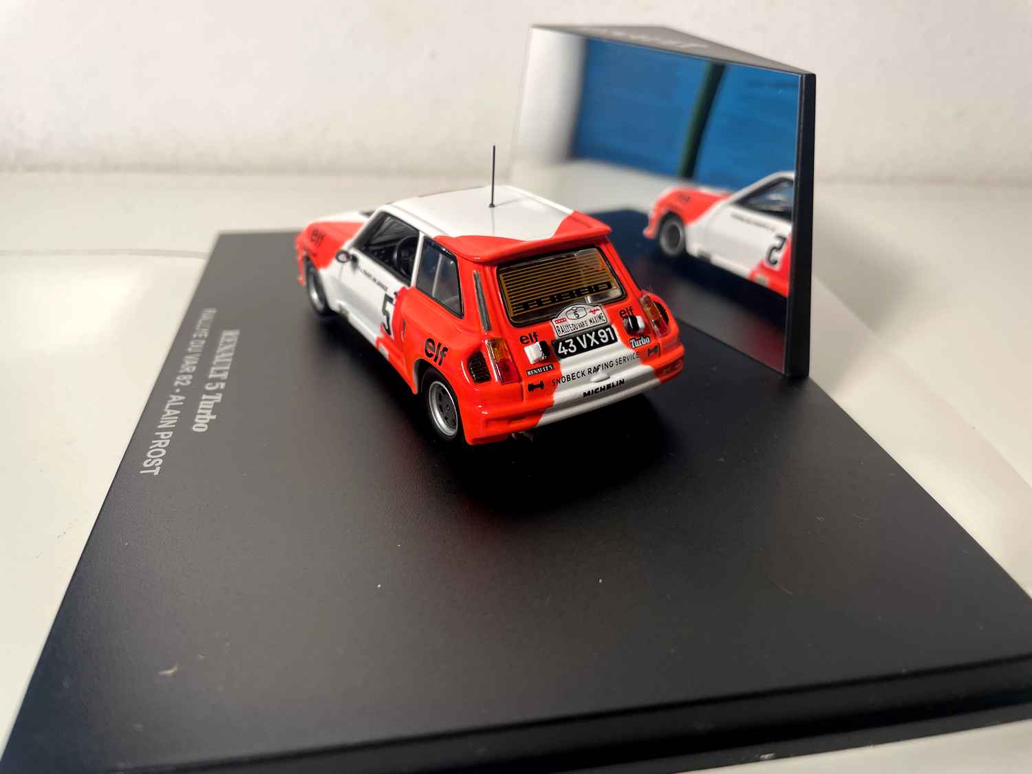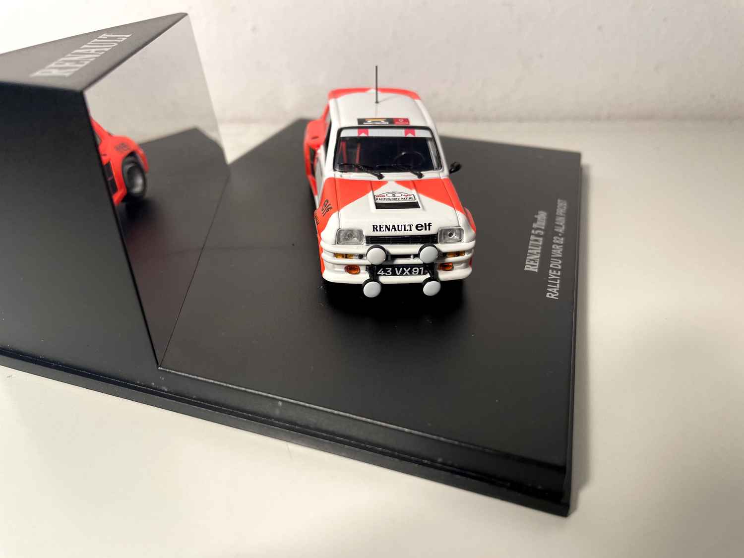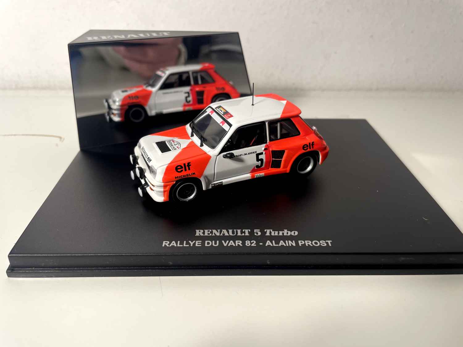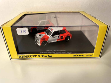 Voiture Miniature Renault 5 Turbo blanche et orange numéro 5 - rallye du Var 1982 - Alain Prost (coffret boite rectangle)