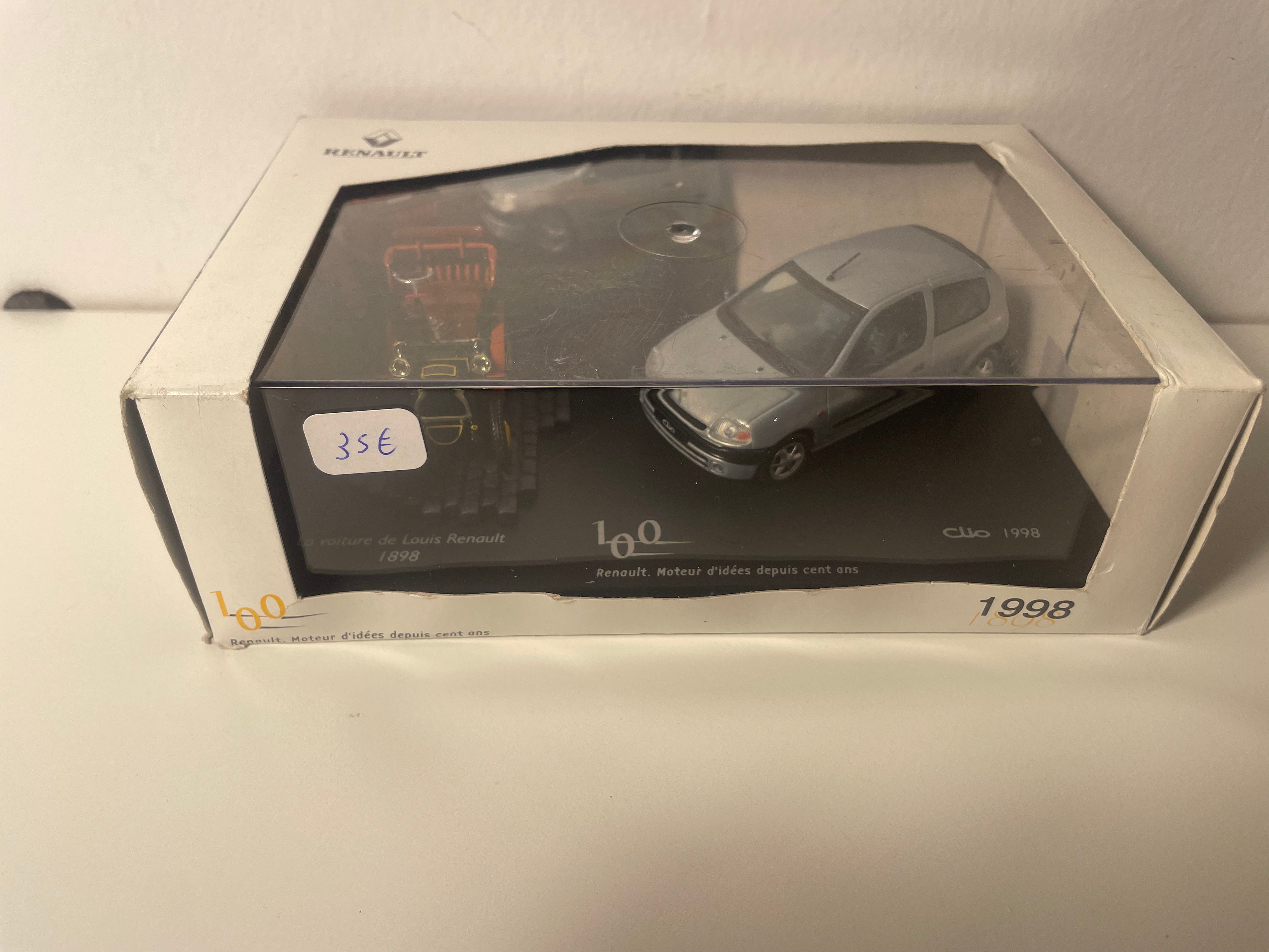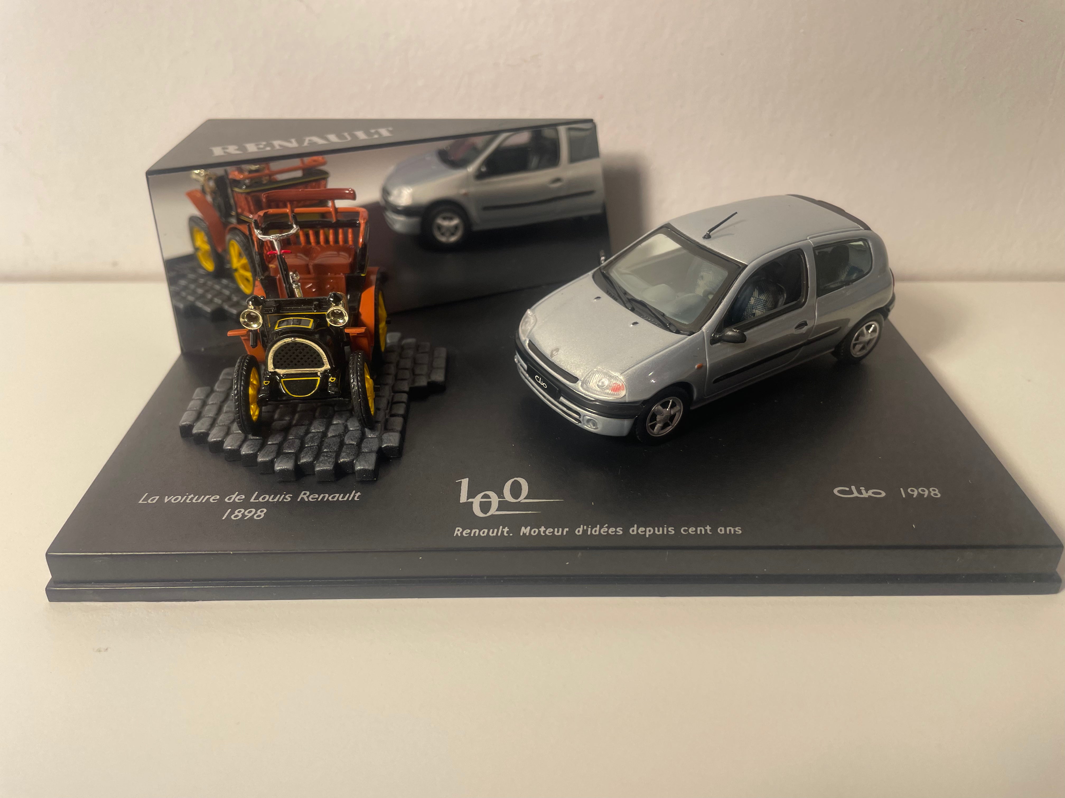 Voiture Miniature Coffret Renault pour le centenaire de Renault comprenant la voiture de Louis Renault de 1898 et une Clio grise de 1998 - VITESSE (coffret boite rectangle)
