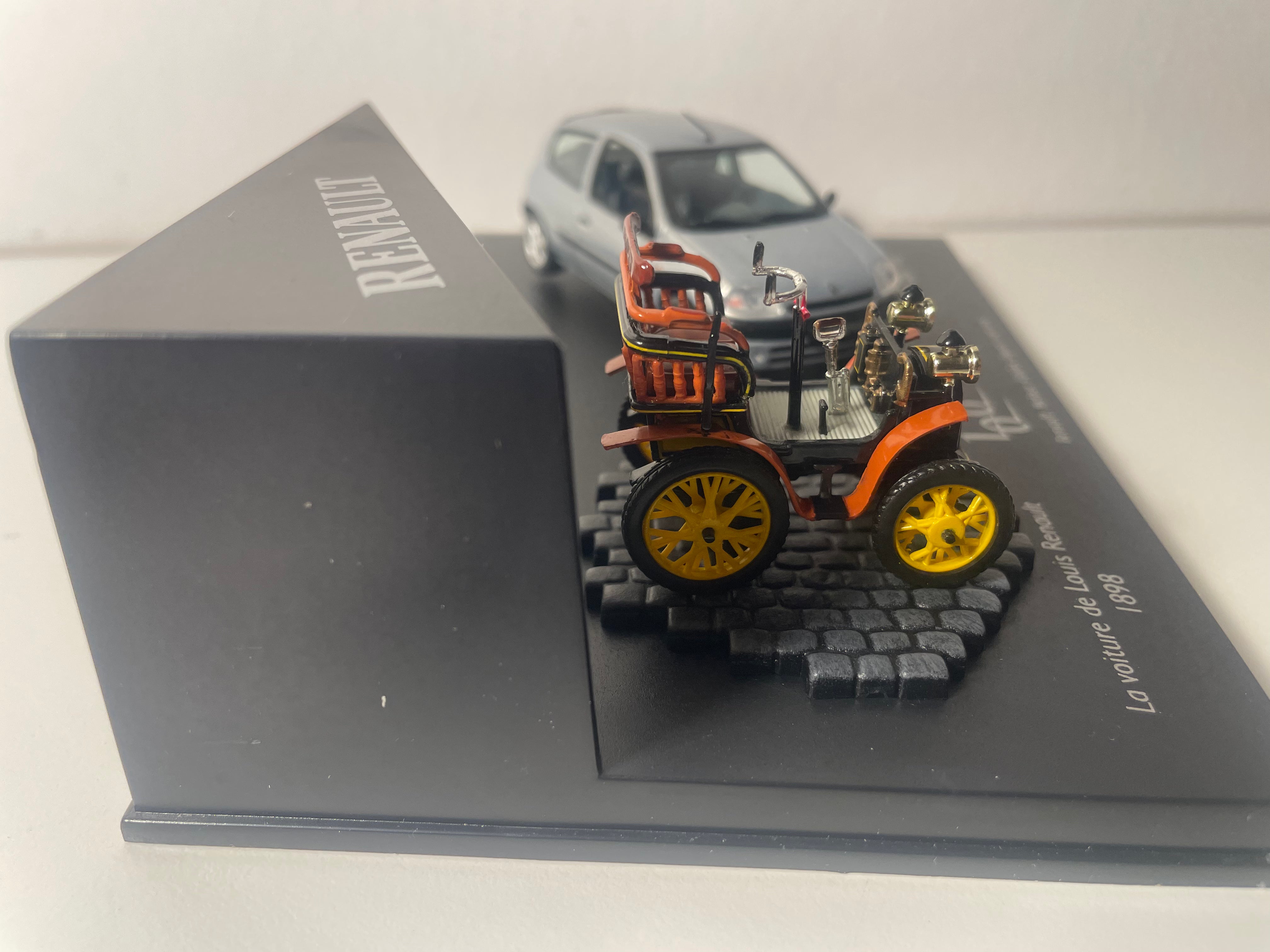 Ce coffret exceptionnel célèbre un siècle d'innovation Renault en réunissant deux modèles emblématiques séparés par exactement 100 ans d'histoire automobile. D'un côté, la toute première voiture de Louis Renault de 1898, de l'autre, une Clio grise de 1998, symbole du renouveau de la marque. Cette collection Vitesse offre aux passionnés une perspective unique sur l'évolution technologique et stylistique du constructeur français.