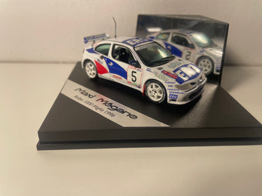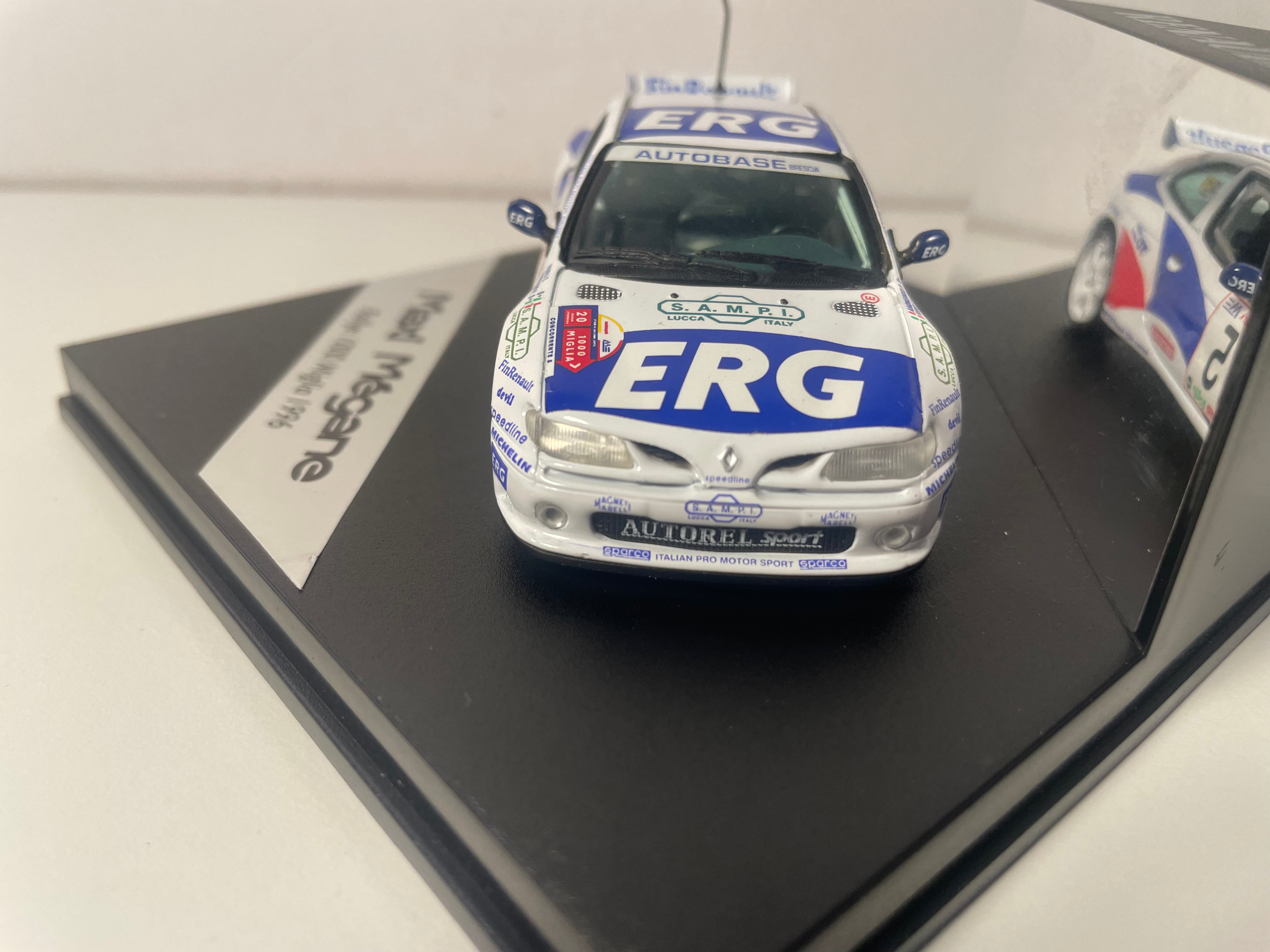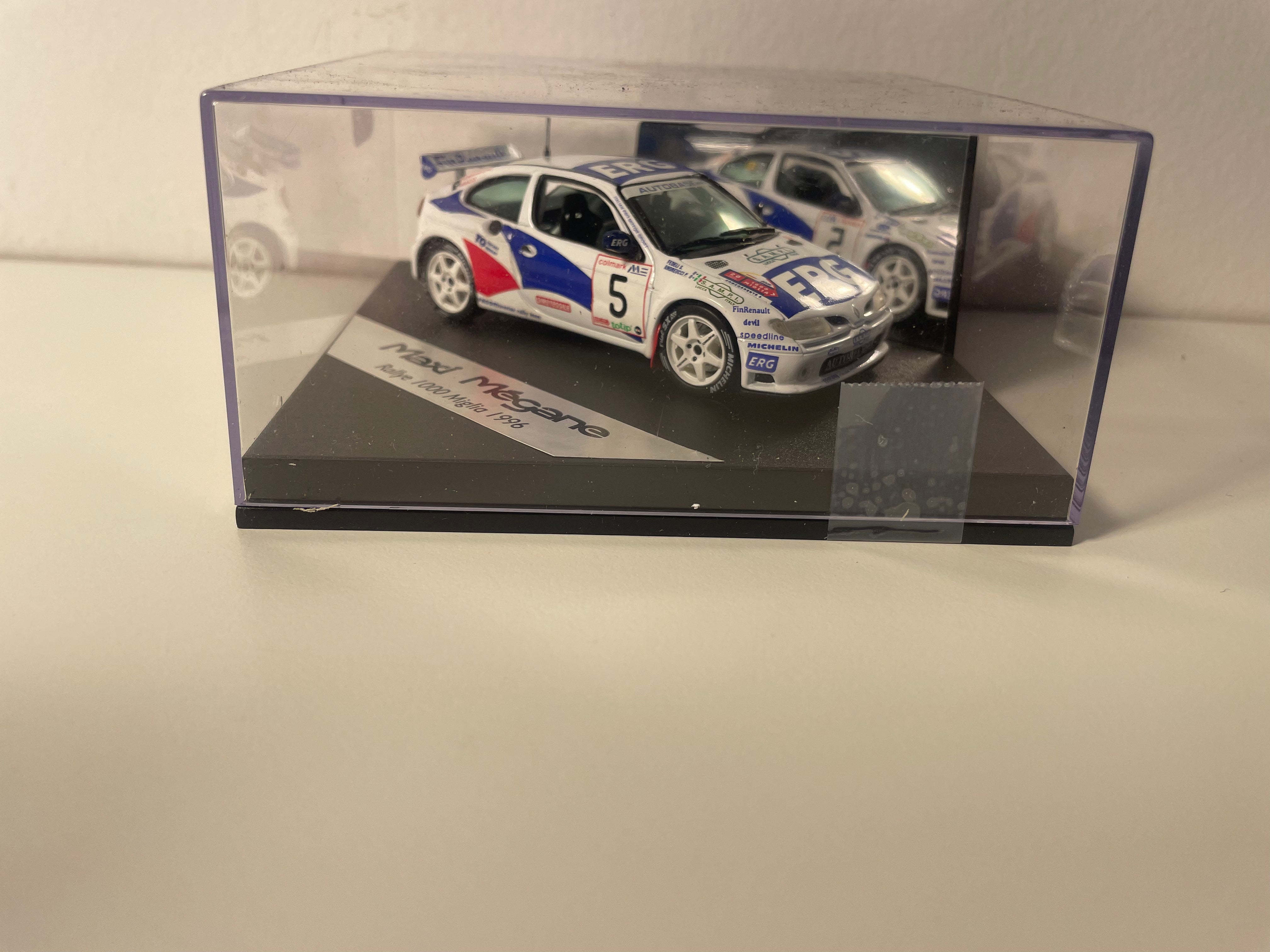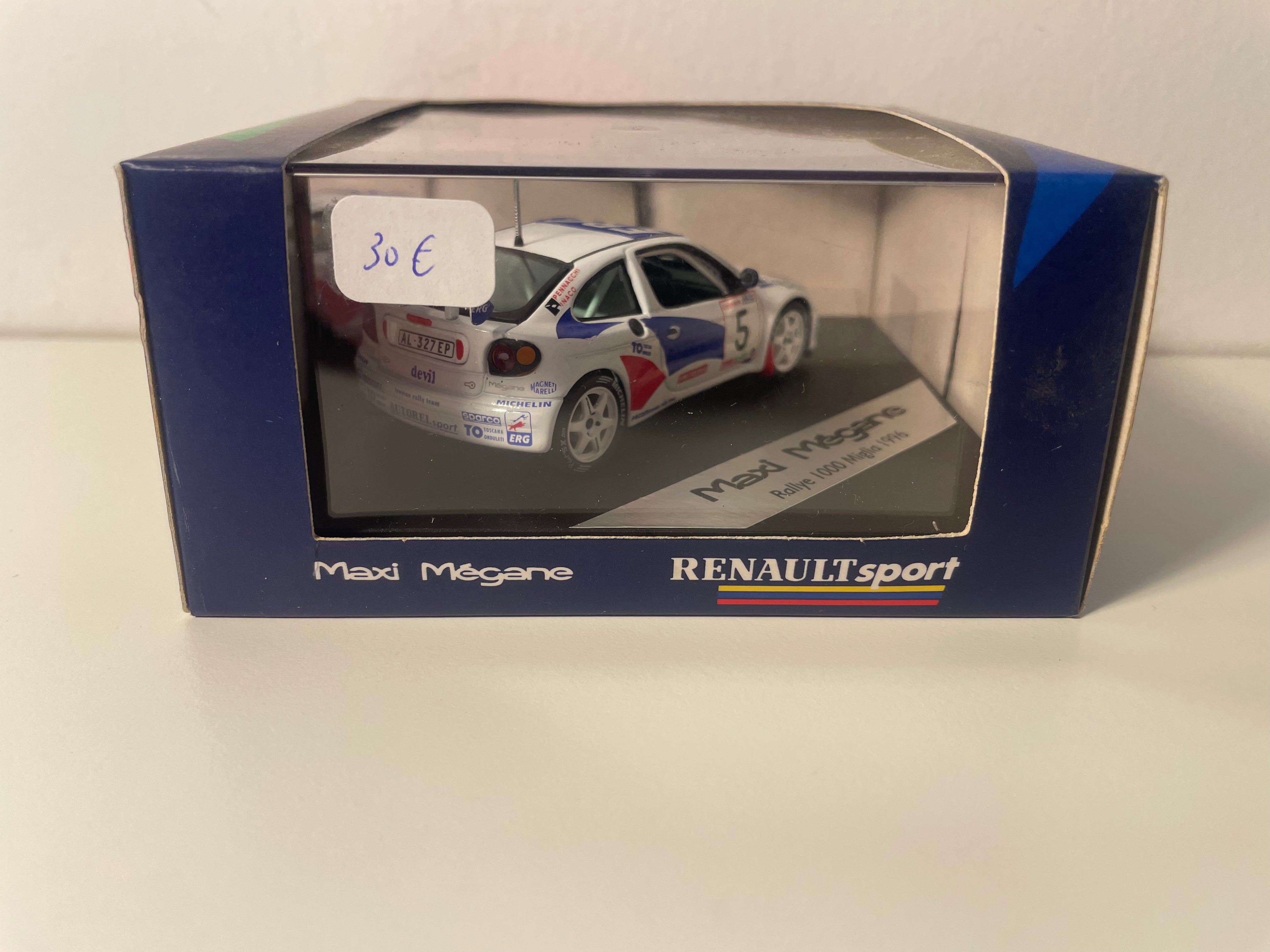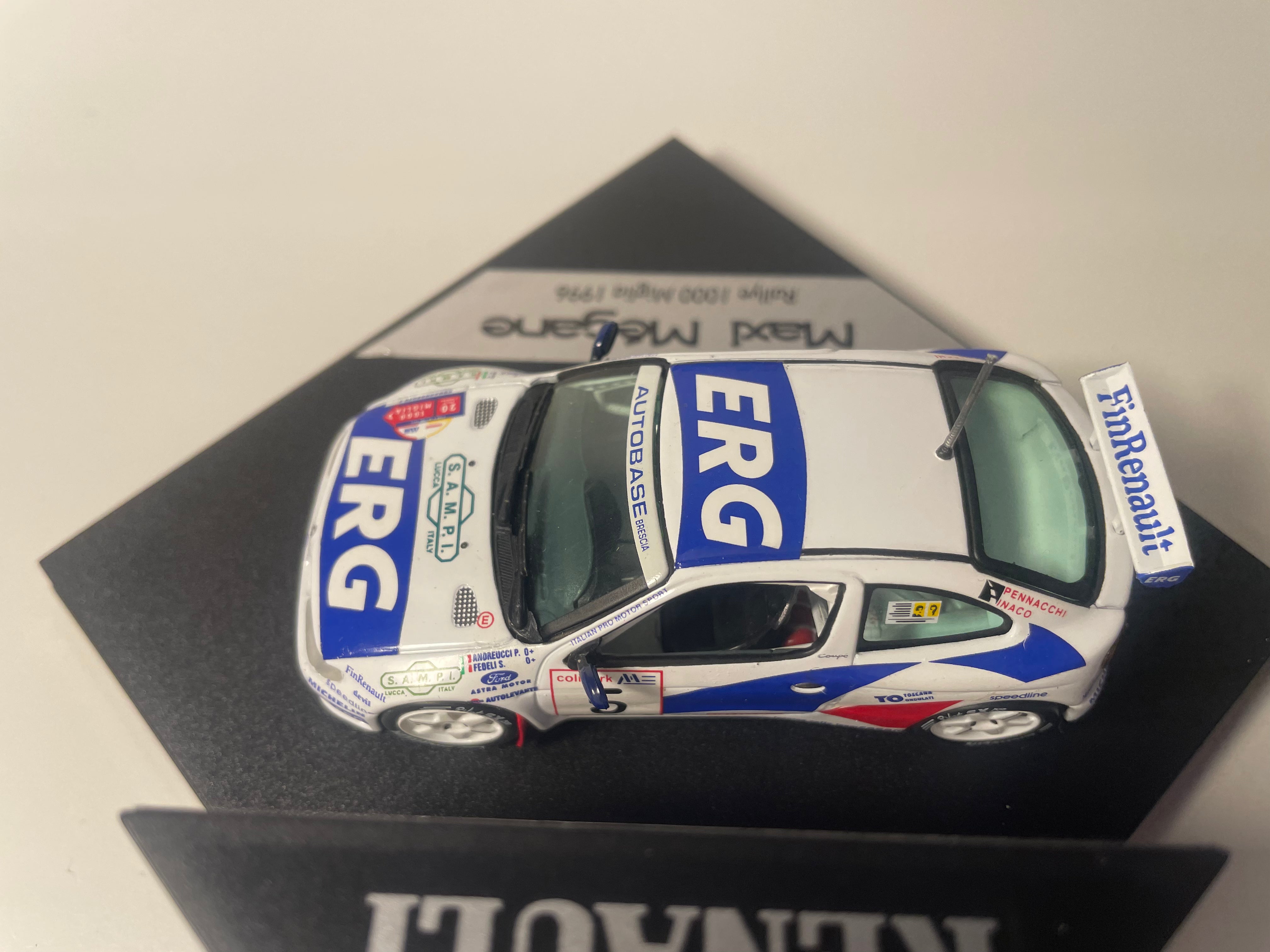 Voiture Miniature Renault Maxi Mégane blanche et bleue numéro 5 - rallye 1000 Miglia de 1996 - Vitesse (boite carrée)