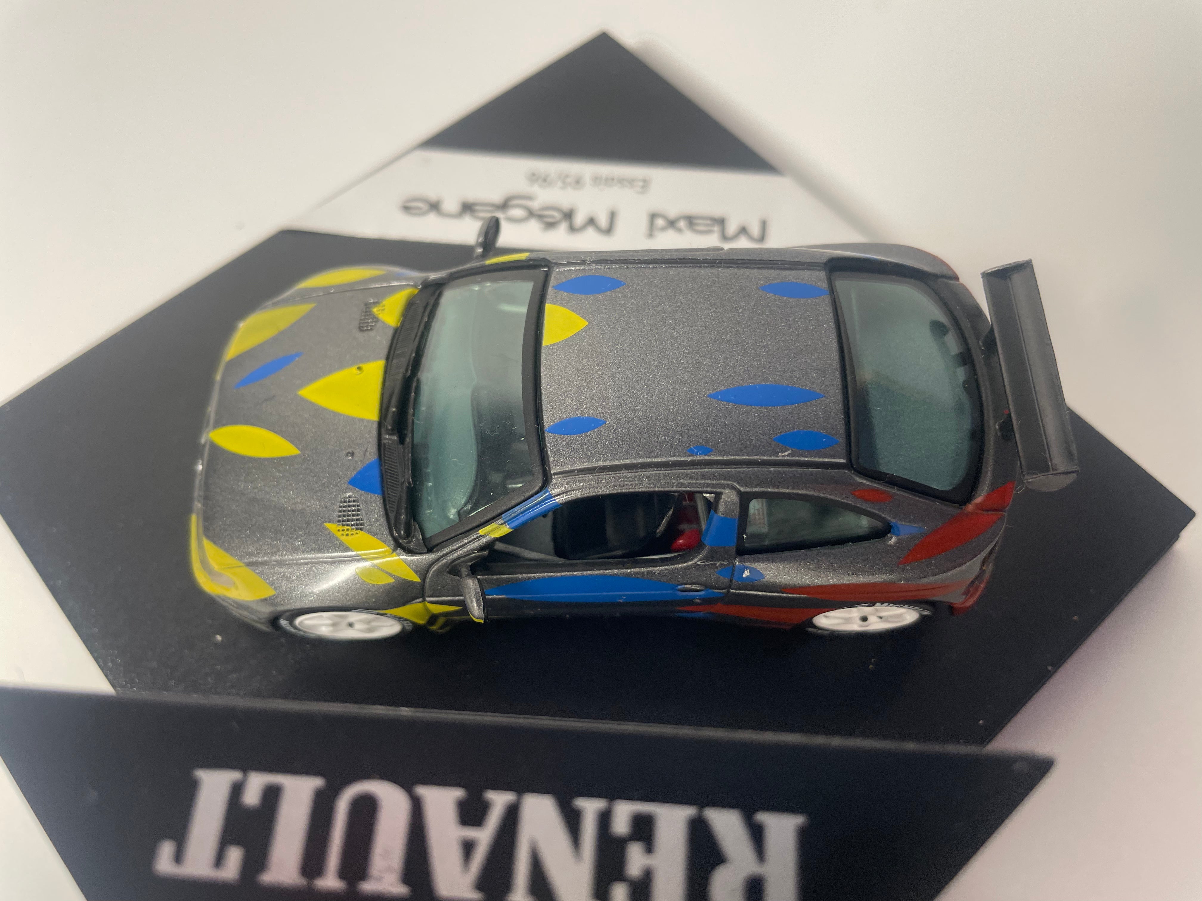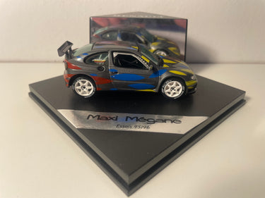 Voiture Miniature Renault Maxi Mégane grise avec dessins jaunes et bleus - Essais 95/96 - Vitesse (boite carrée)