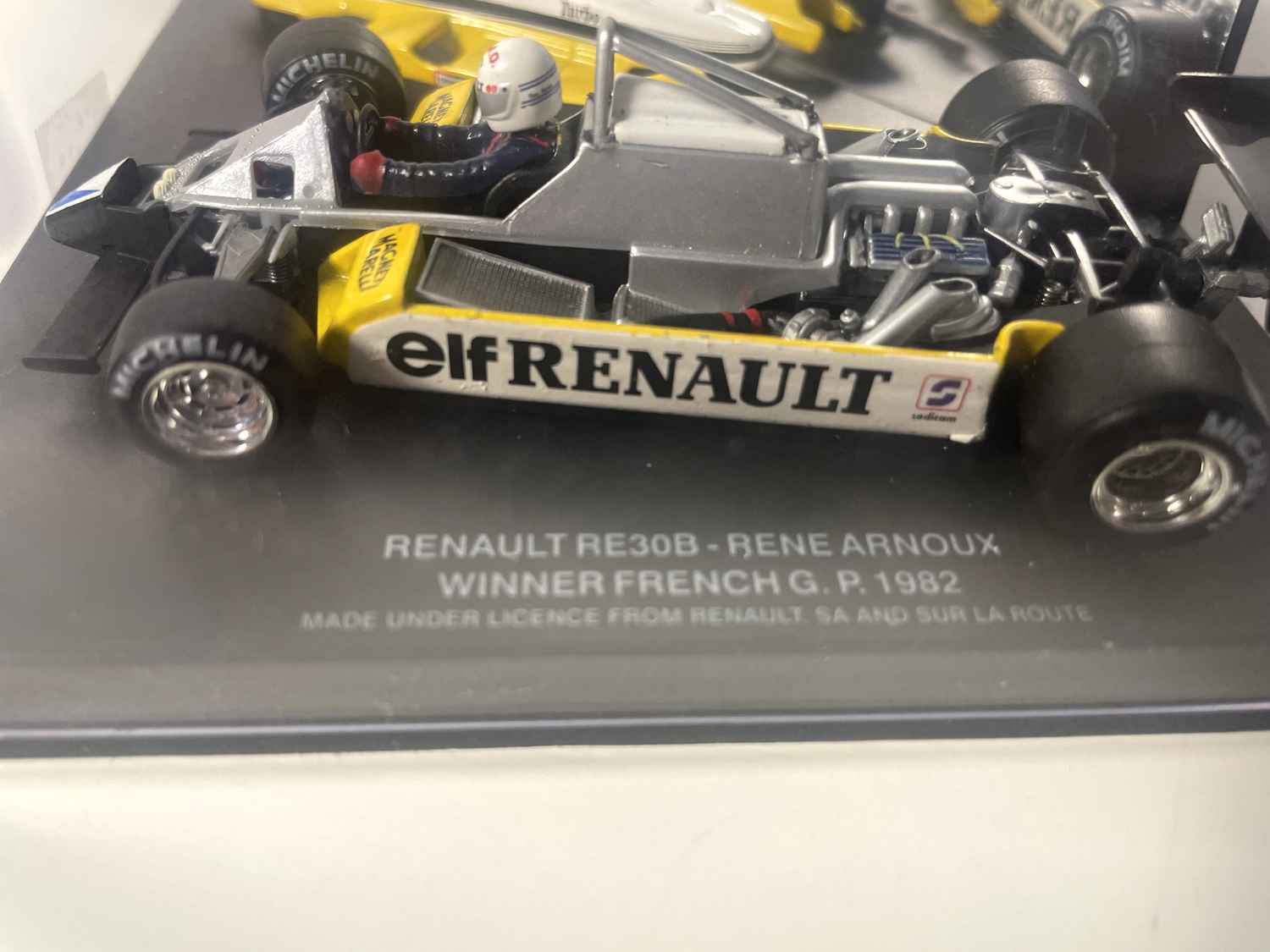 Cette reproduction détaillée représente bien plus qu'une simple miniature : elle immortalise une victoire historique de Renault sur ses terres, marquant l'apogée de l'engagement du constructeur français en Formule 1 durant les années 1980.