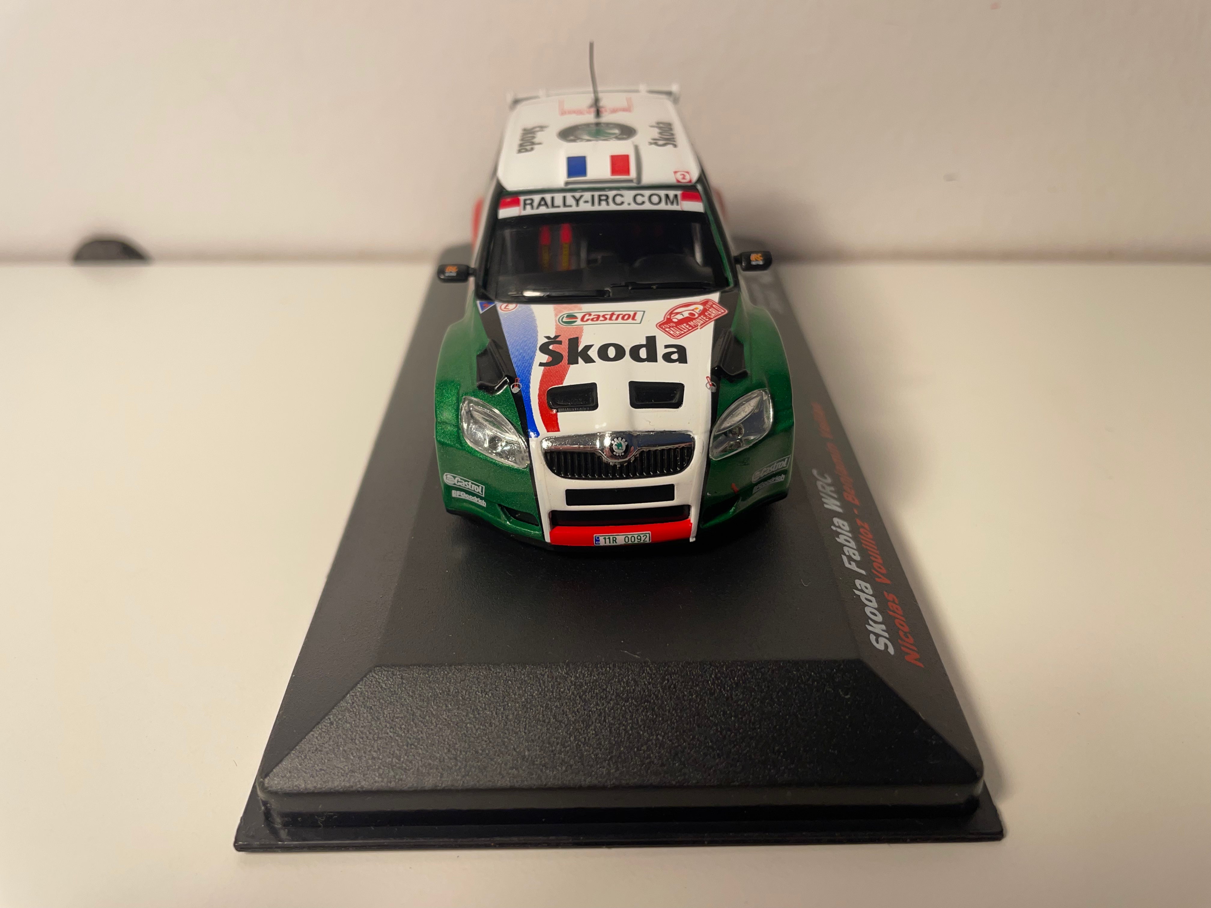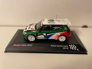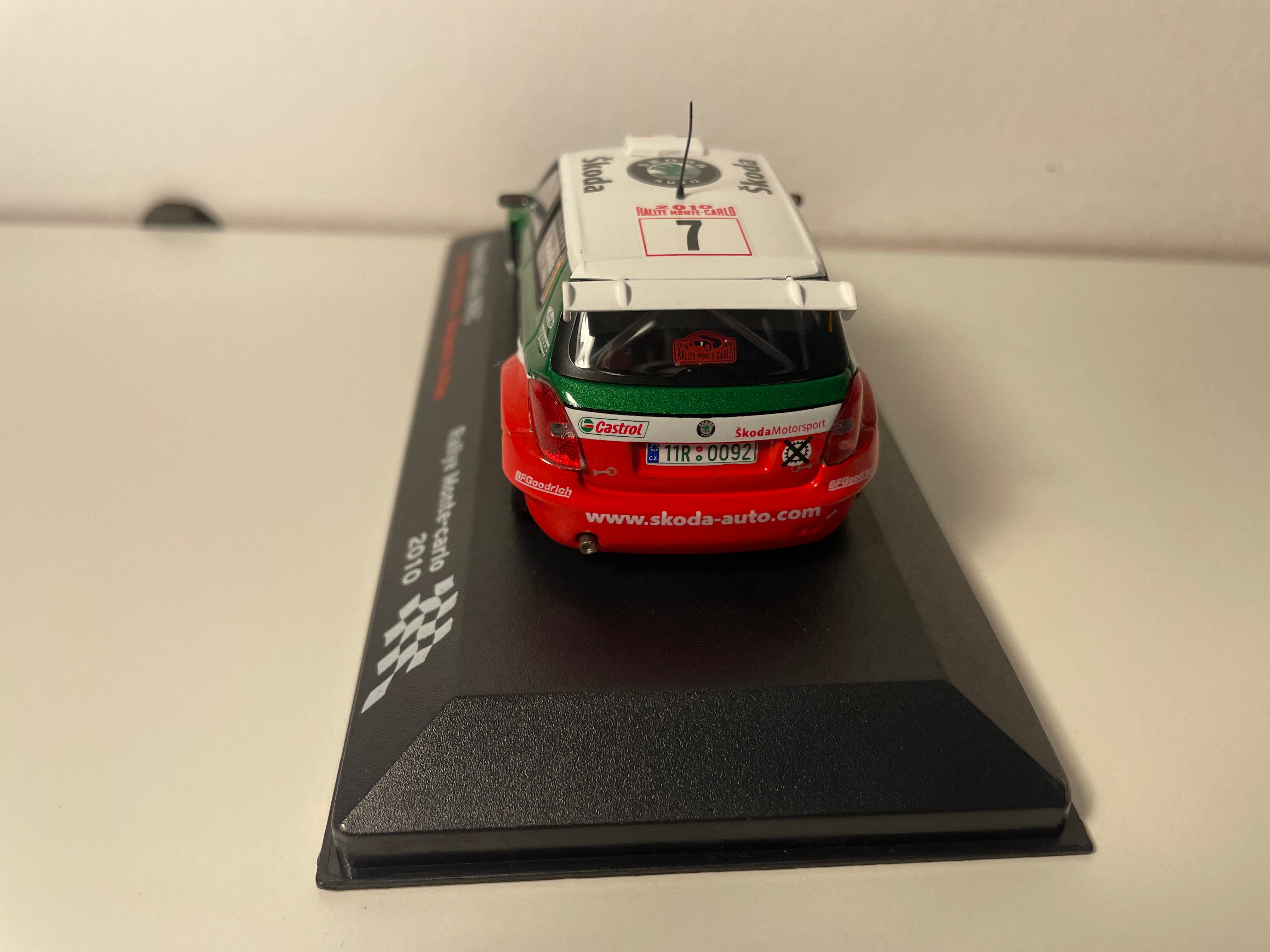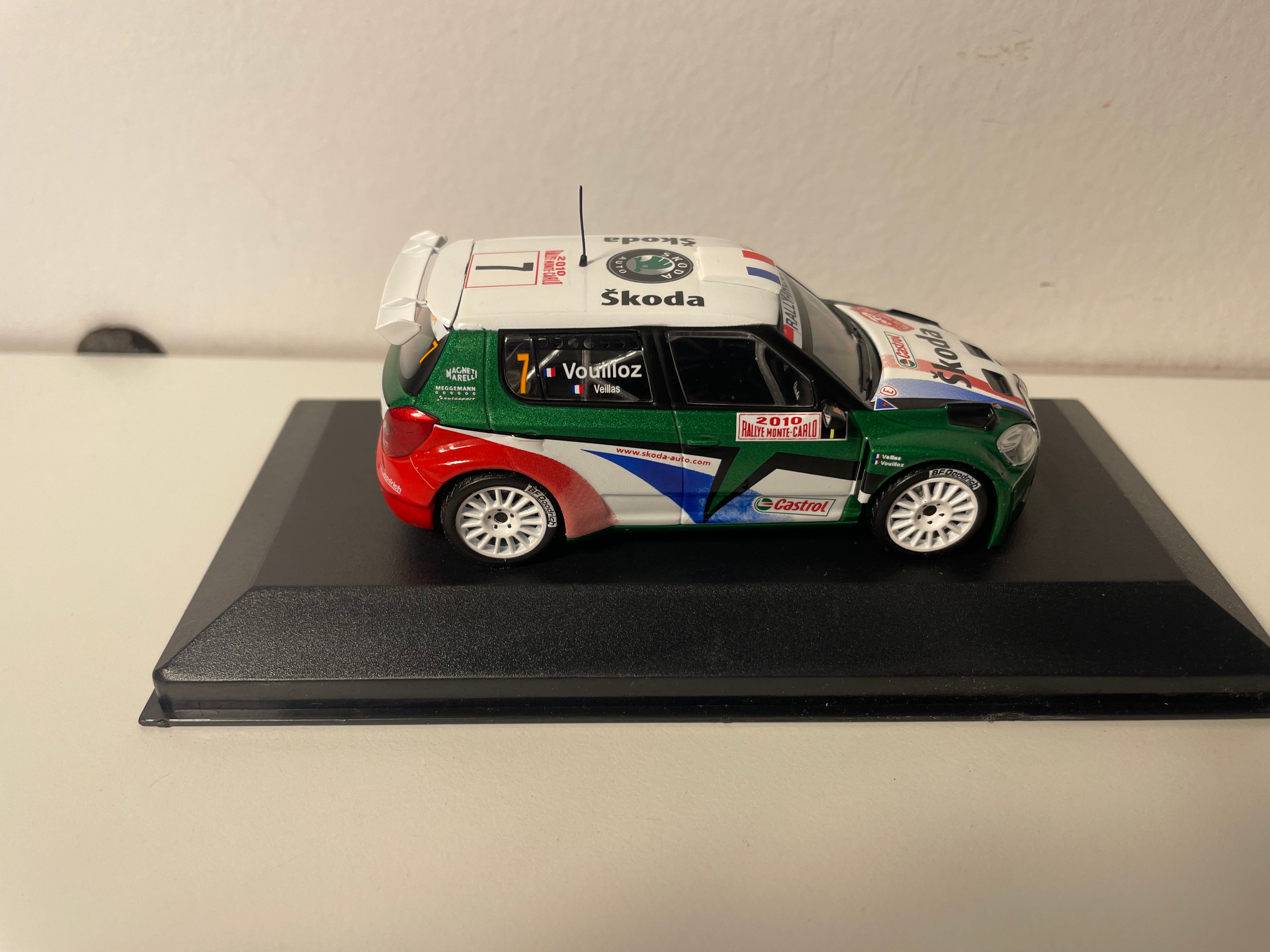 Voiture Miniature Skoda Fabia WRC blanche, verte, rouge et bleue numéro 7 - Rallye Monté-Carlo 2010