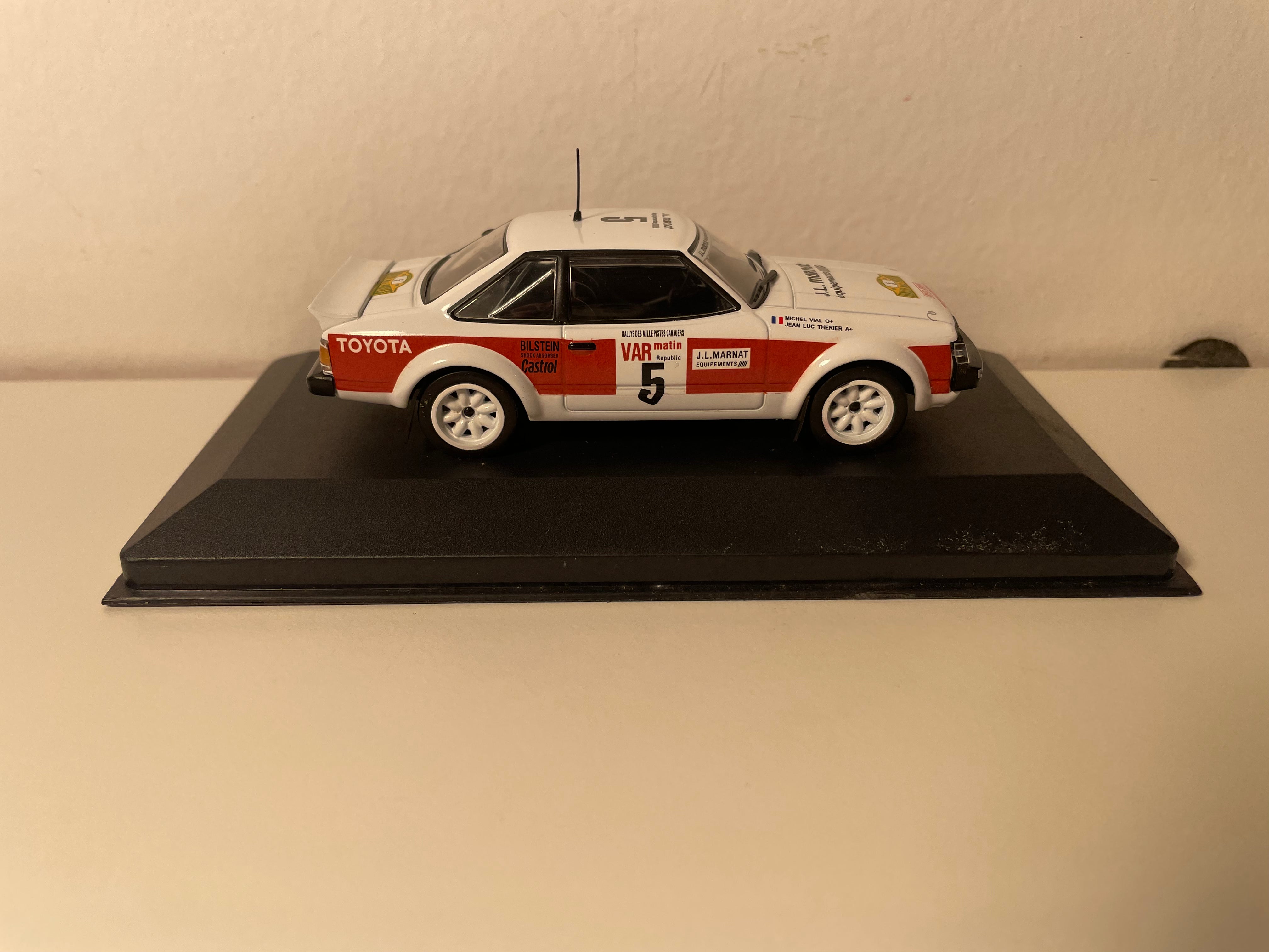 Voiture Miniature Toyota Célica 2000GT blanche et rouge numéro 5 - rallye des 1000 pistes 1979