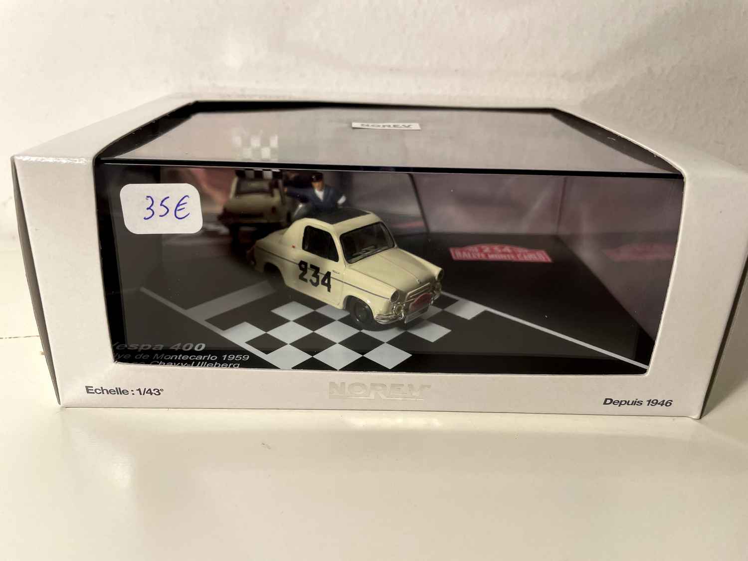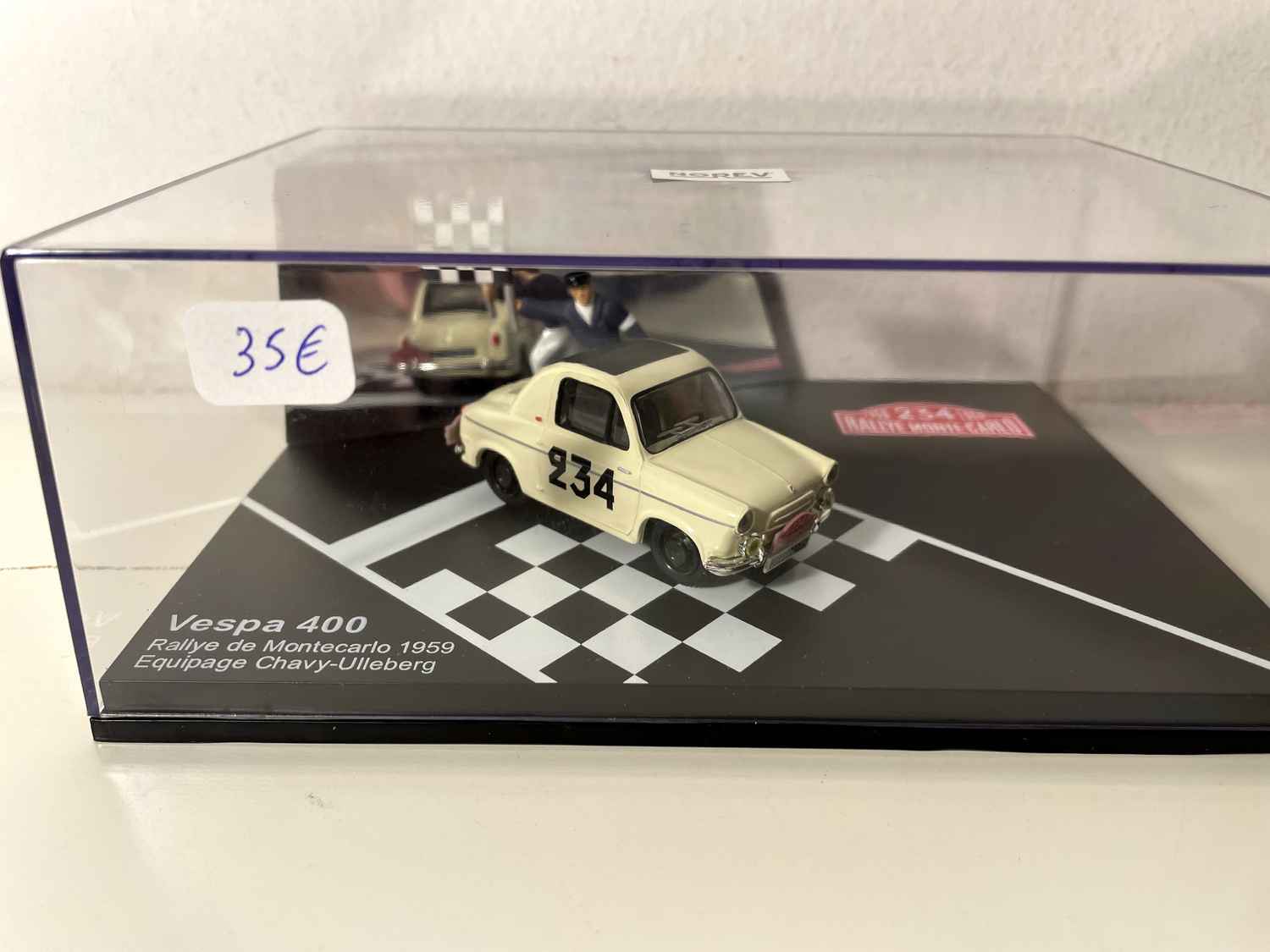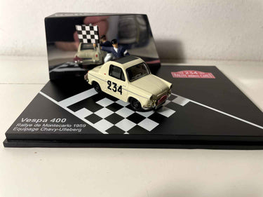 Découvrez cette Vespa 400 beige numéro 234 qui a participé au prestigieux Rallye de Monte-Carlo de 1959. Cette miniature NOREV au 1/43ème reproduit fidèlement la petite voiture pilotée par l'équipage Chavy/Ulleberg lors de cette édition légendaire du rallye monégasque.