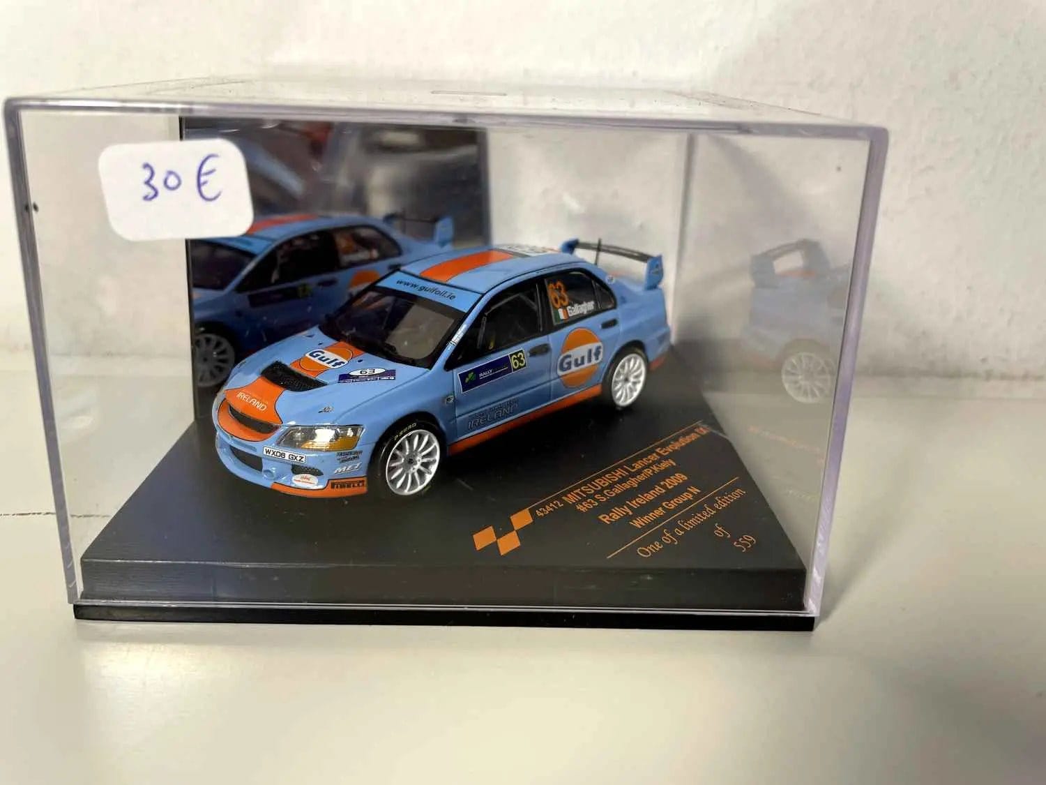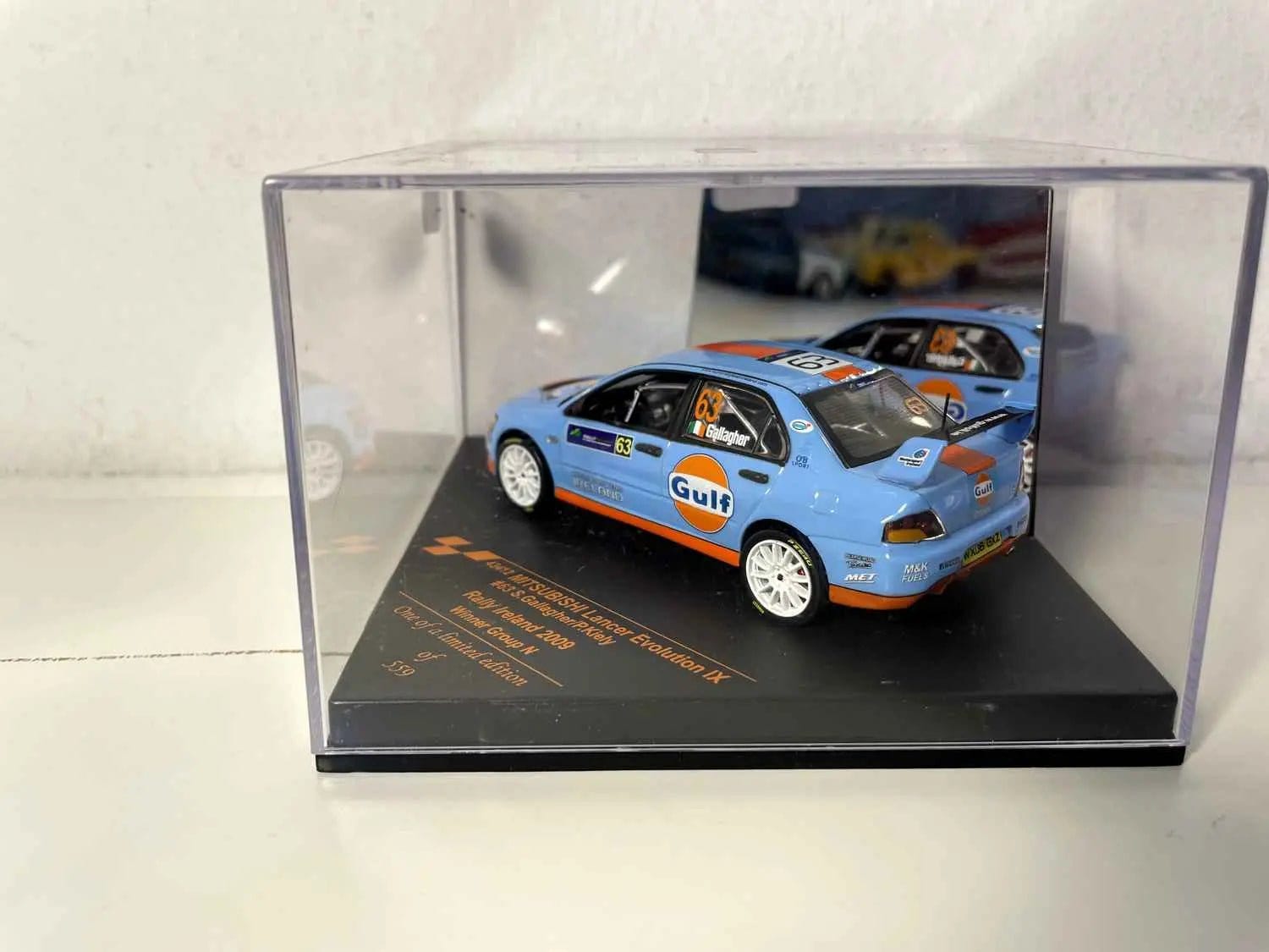 Este modelo à escala 1/43 representa o lendário Mitsubishi Lancer Evolution IX na sua icónica pintura Gulf, com as suas características cores azul e laranja. Este modelo evoca a participação no Rali da Irlanda de 2009 , pilotado pela equipa S. Gallagher/P. Kiely sob o número 6.