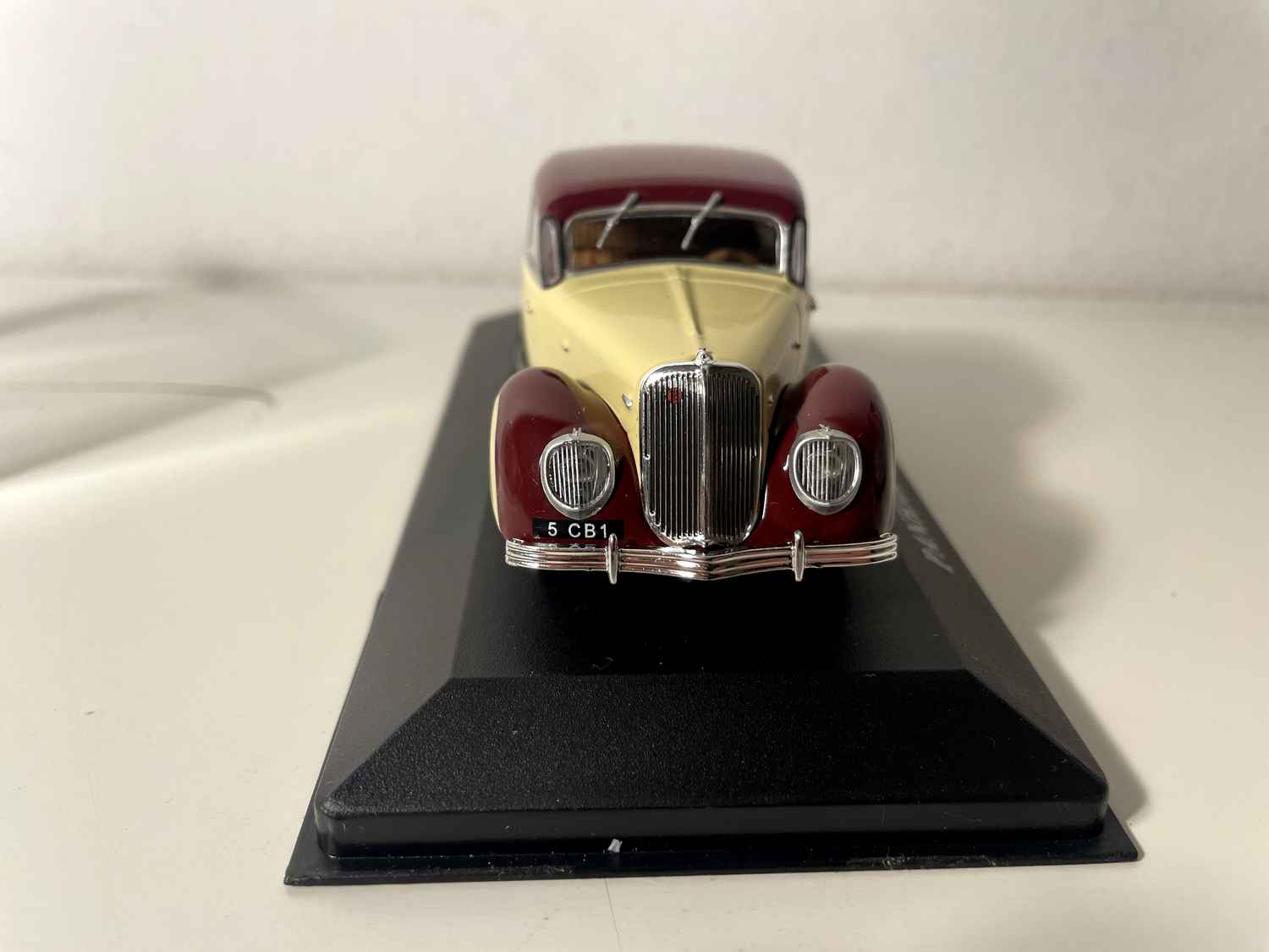 Esta miniatura do Panhard Dynamic de 1939, com pintura bordeaux e bege, representa um dos modelos mais ousados da história automóvel francesa. Reproduzido à escala 1:43 com uma notável atenção aos detalhes, este item de colecção capta perfeitamente o espírito vanguardista deste revolucionário sedan dos anos 30.