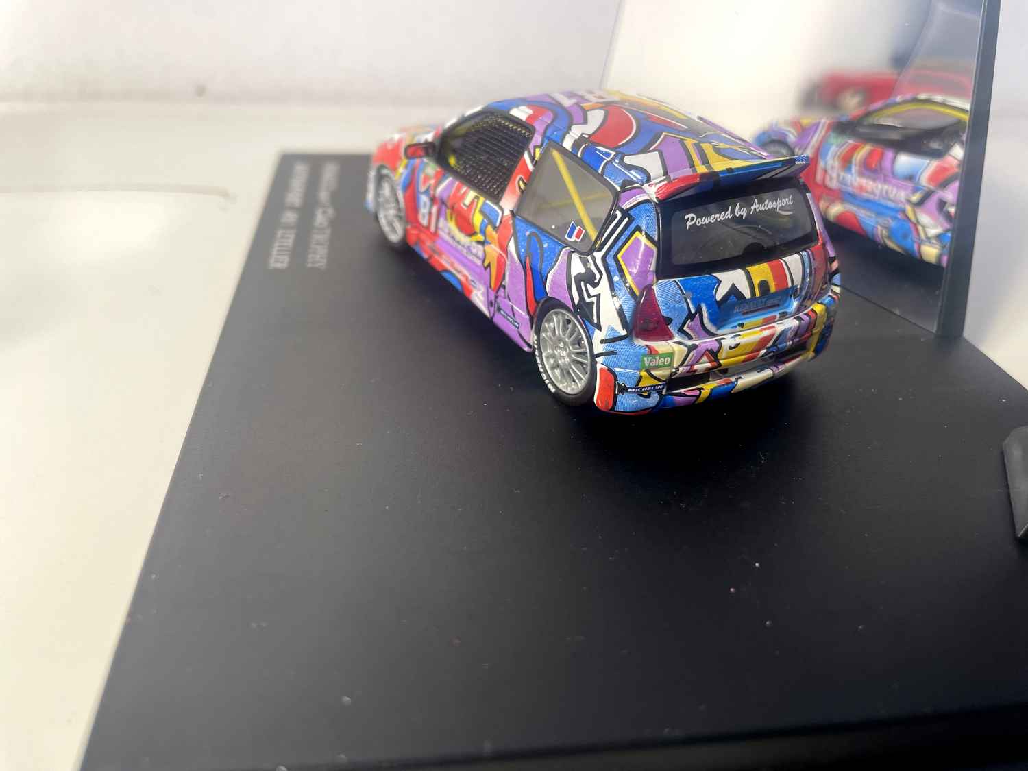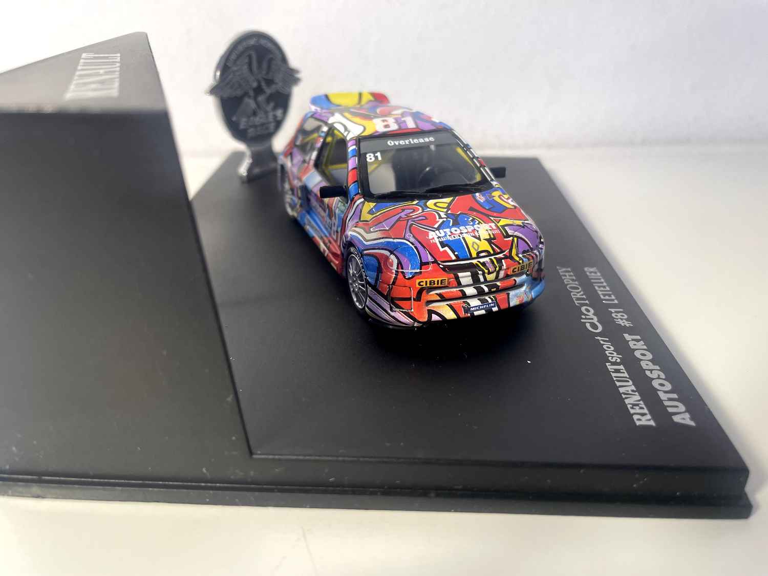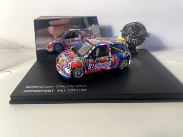 Esta miniatura Renault Sport Clio Trophy da Eagle Collections captura a essência do automobilismo francês em sua forma mais pura. Reproduzindo fielmente o modelo número 81 pilotado por Letellier, esta réplica em escala 1/43 se destaca pela sua espetacular pintura multicolorida que reflete o espírito festivo e competitivo das corridas de Clio Trophy.